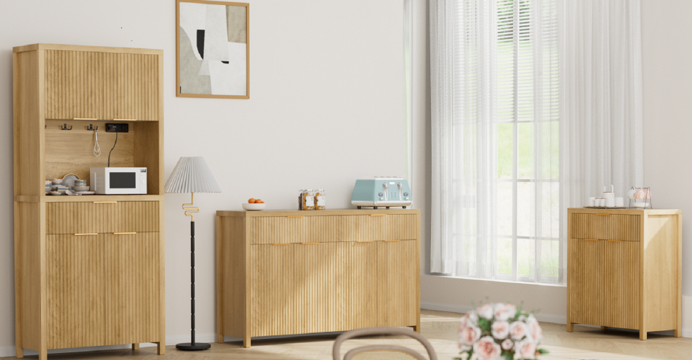 Buffet Cabinet with 2 Drawers, 55" Storage Cabinet with Fluted Panel Doors, Adjustable Shelves for Kitchen, TV Stands for Living Room, Natural Oak