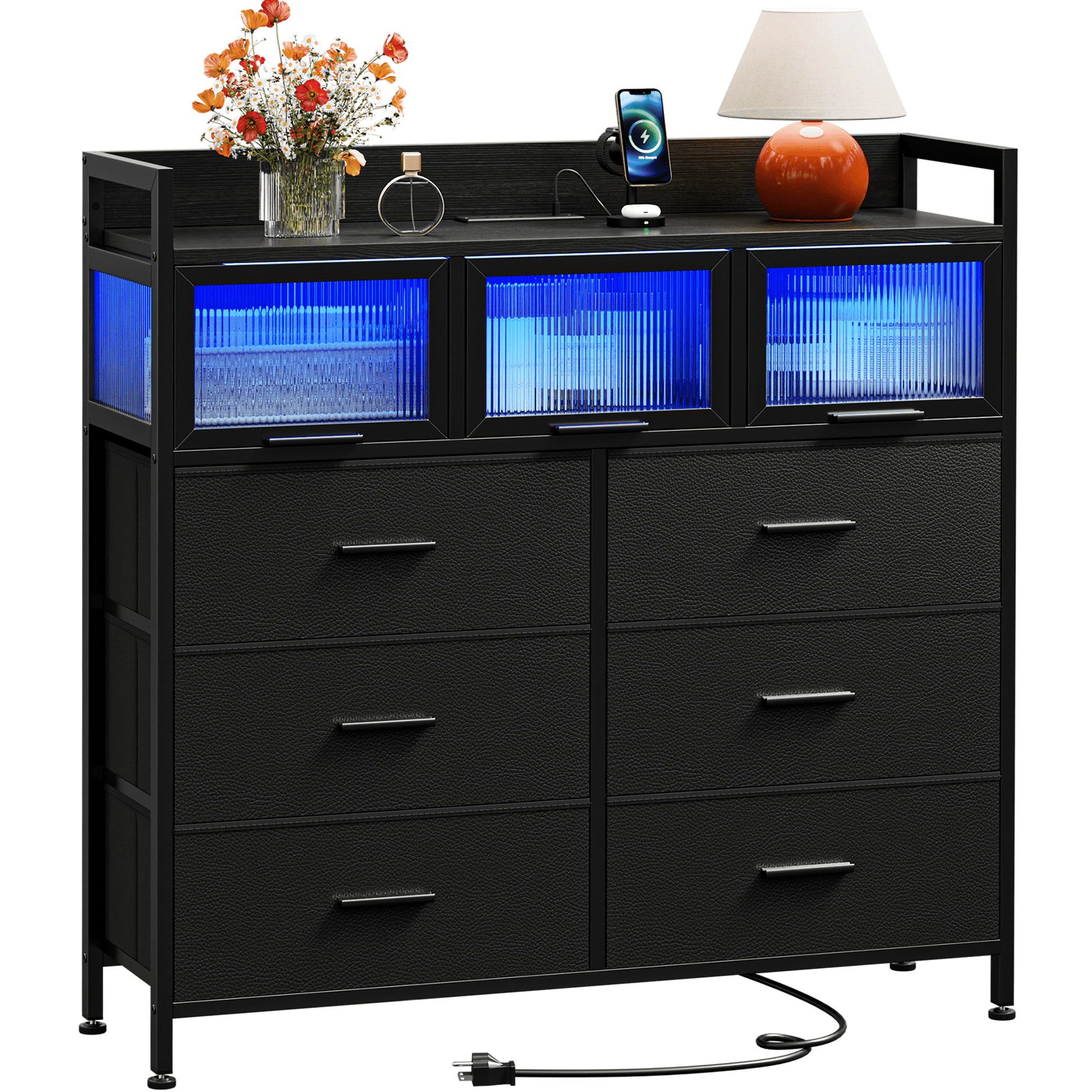 6 Drawer Dresser with Acrylic Clear Drawer Covers, LED Lights and Charging Station, Modern Chest for Bedroom and Living Room,Black