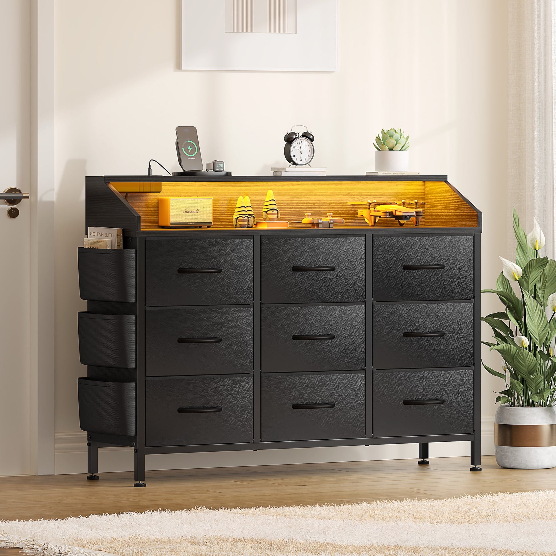 Dresser for Bedroom, 9 Drawer Dresser with LED Lights and Charging Station, Wide Chest of 6 Drawers with Open Space, Modern Large Capacity Storage Cabinet, Living Room, Hallway, Black PU