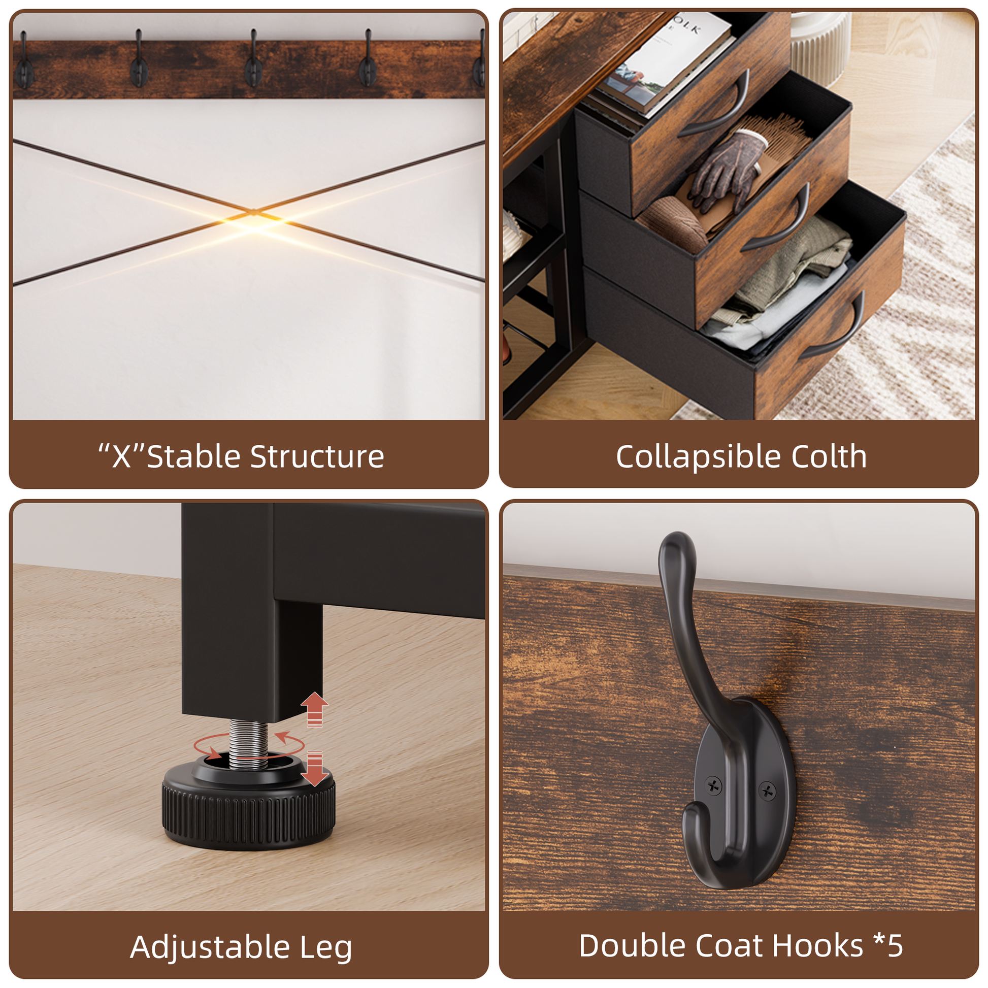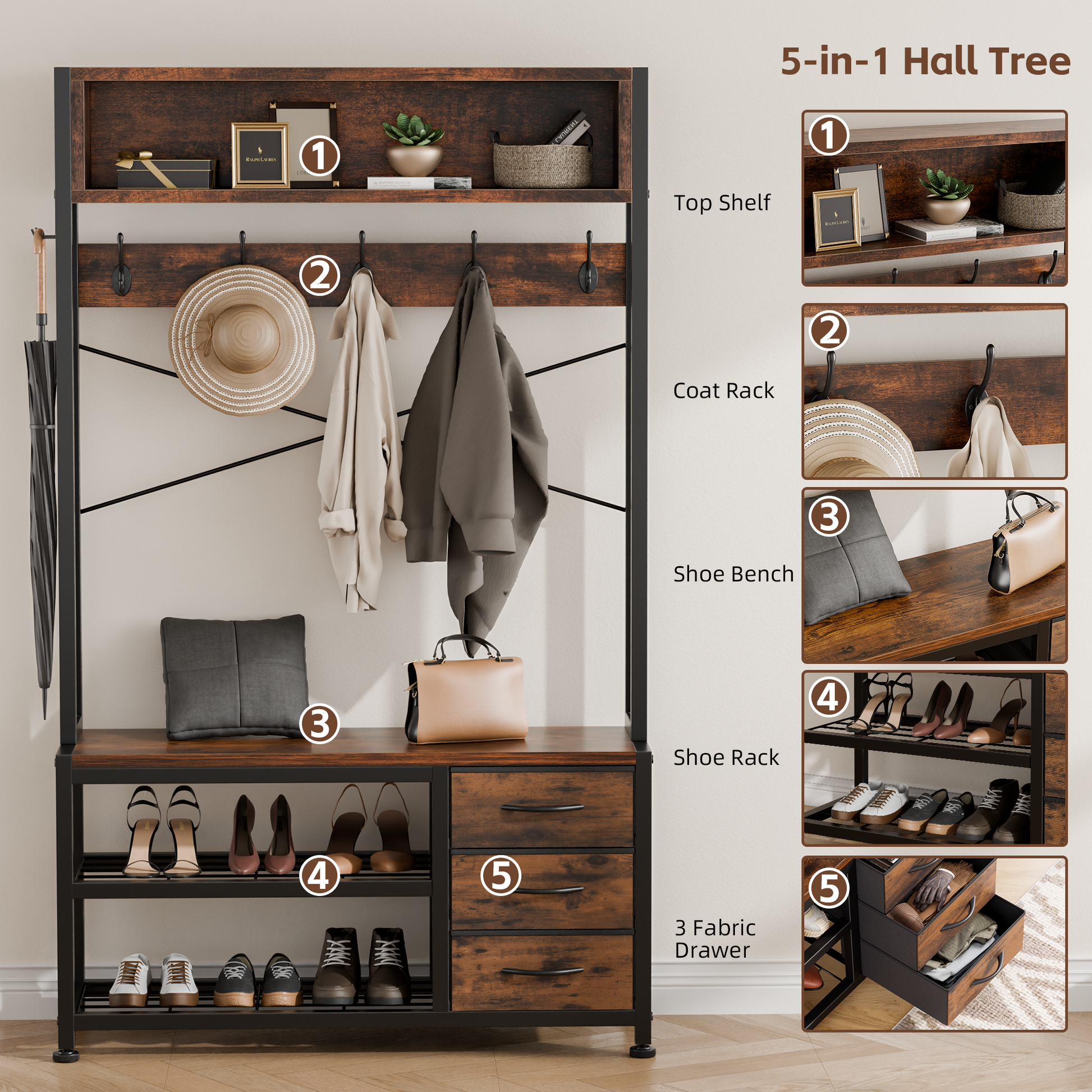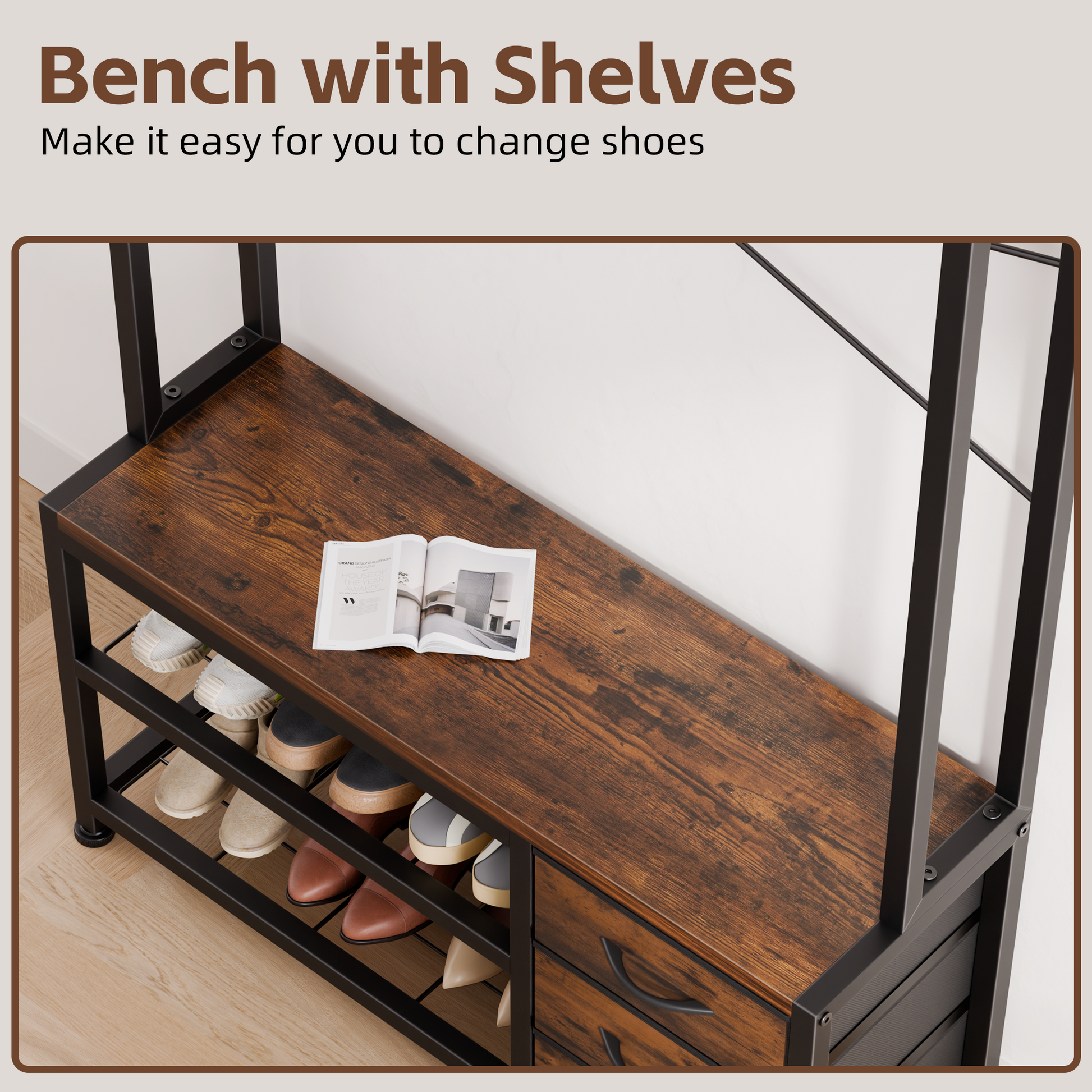 5-in-1 Hall Tree with Smart Storage: This entryway bench features 7 movable hooks for coats & bags, a 300lb-rated bench, 3 drawers (for keys & accessories), 2 shoe racks, and a top shelf (for decor & books). Perfect for keeping hallways tidy!