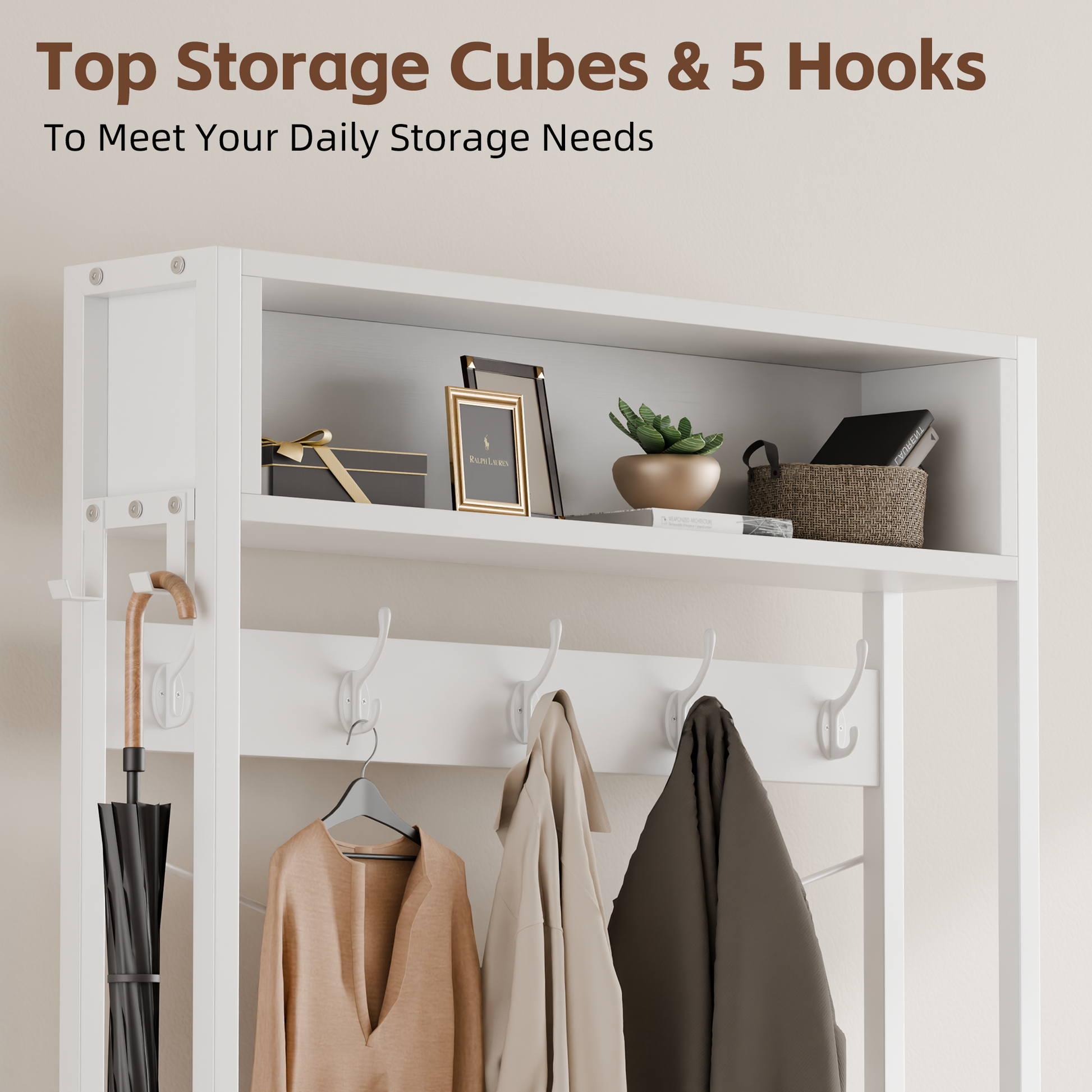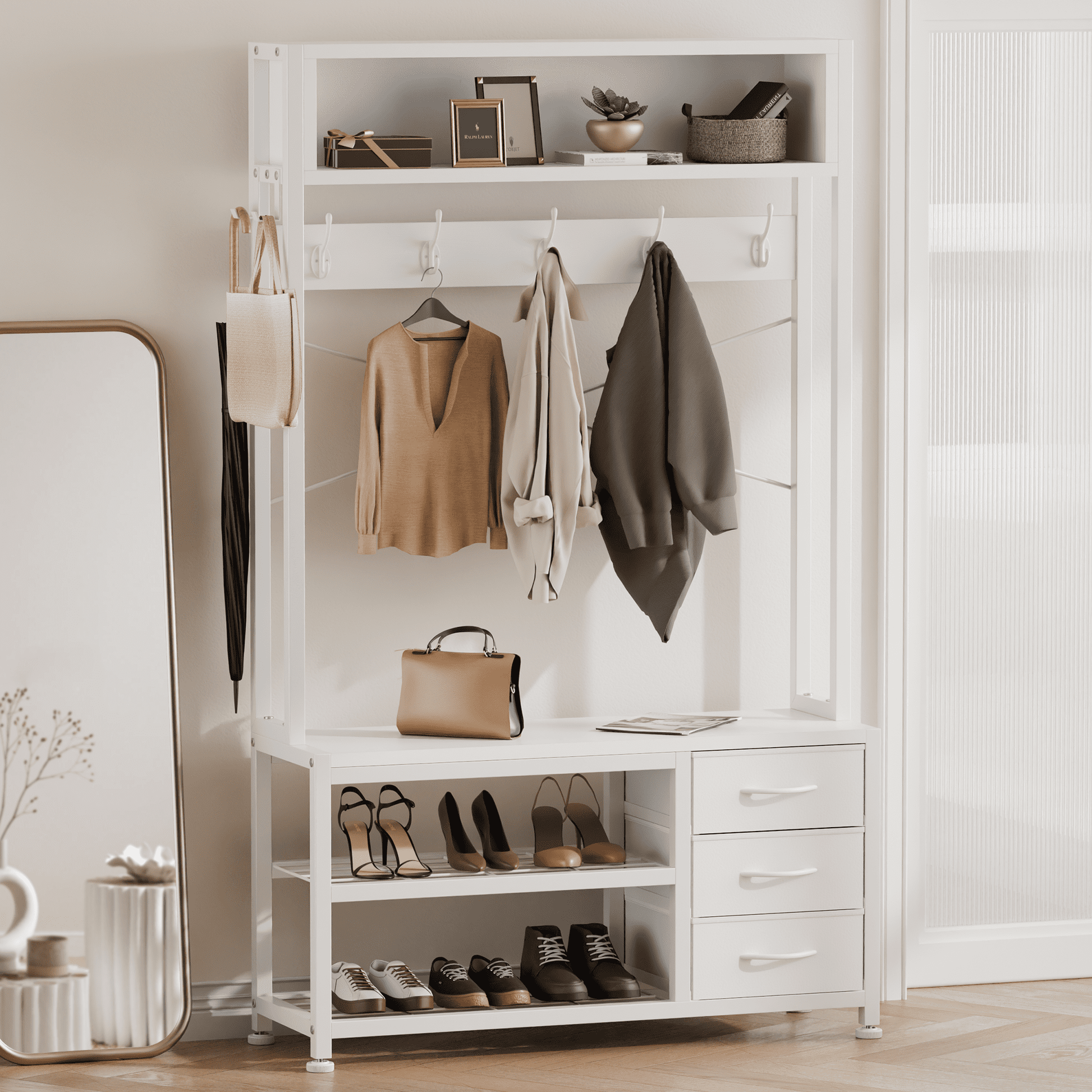 5-in-1 Hall Tree with Smart Storage: This entryway bench features 7 movable hooks for coats & bags, a 300lb-rated bench, 3 drawers (for keys & accessories), 2 shoe racks, and a top shelf (for decor & books). Perfect for keeping hallways tidy!