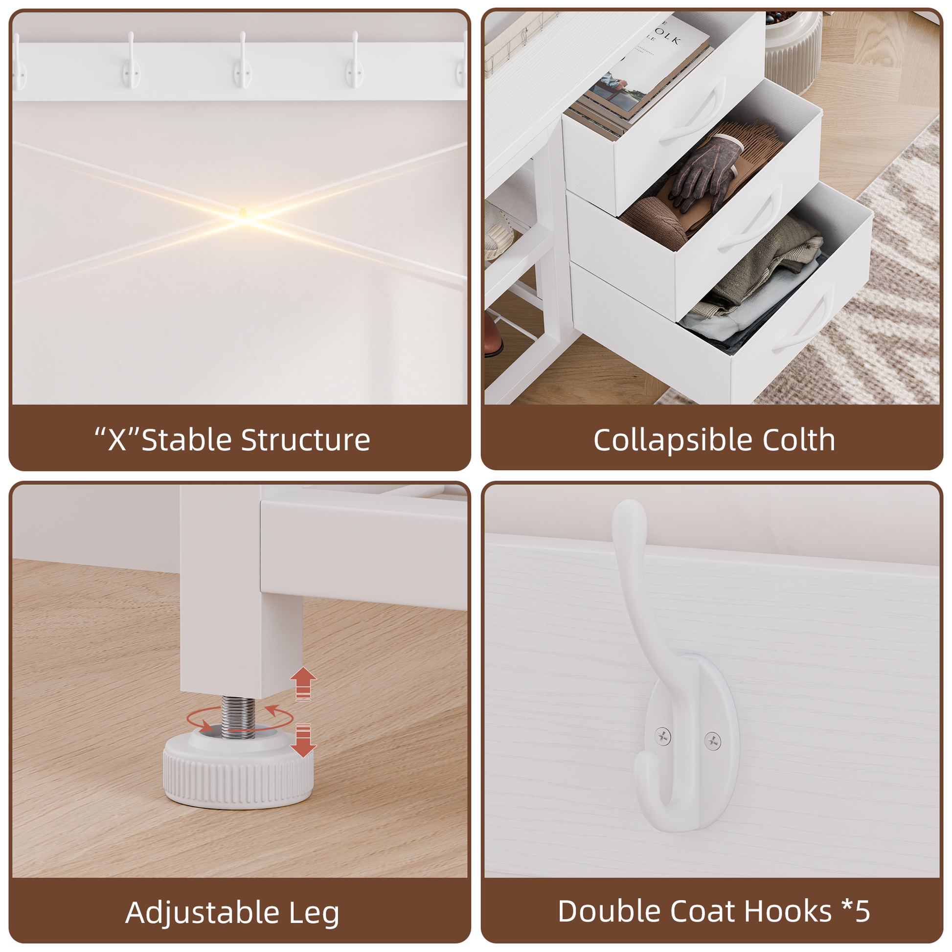 Heavy-Duty & Customizable: Built with a steel frame and engineered wood, this hall tree with bench supports daily use. Detachable hooks and adjustable foot pads let you fit it anywhere—even uneven floors!
