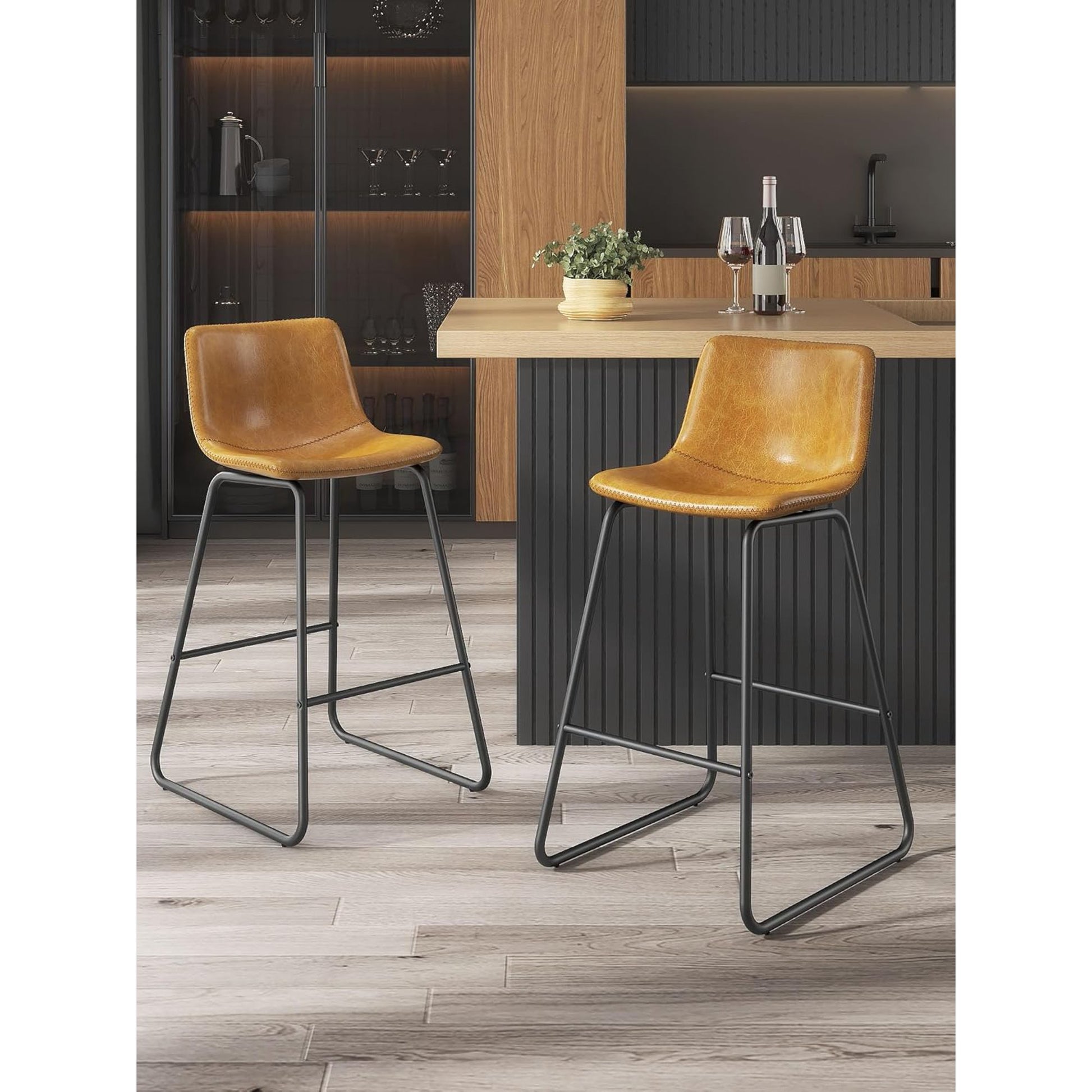 Versatile Modern Design: The sleek industrial aesthetic blends seamlessly with contemporary, rustic or mid-century decor. At counter height with a compact 17.72" wide seat, these height barstools tuck neatly under bars and islands. The neutral whiskey brown color complements wood tones, metals and most color schemes beautifully.