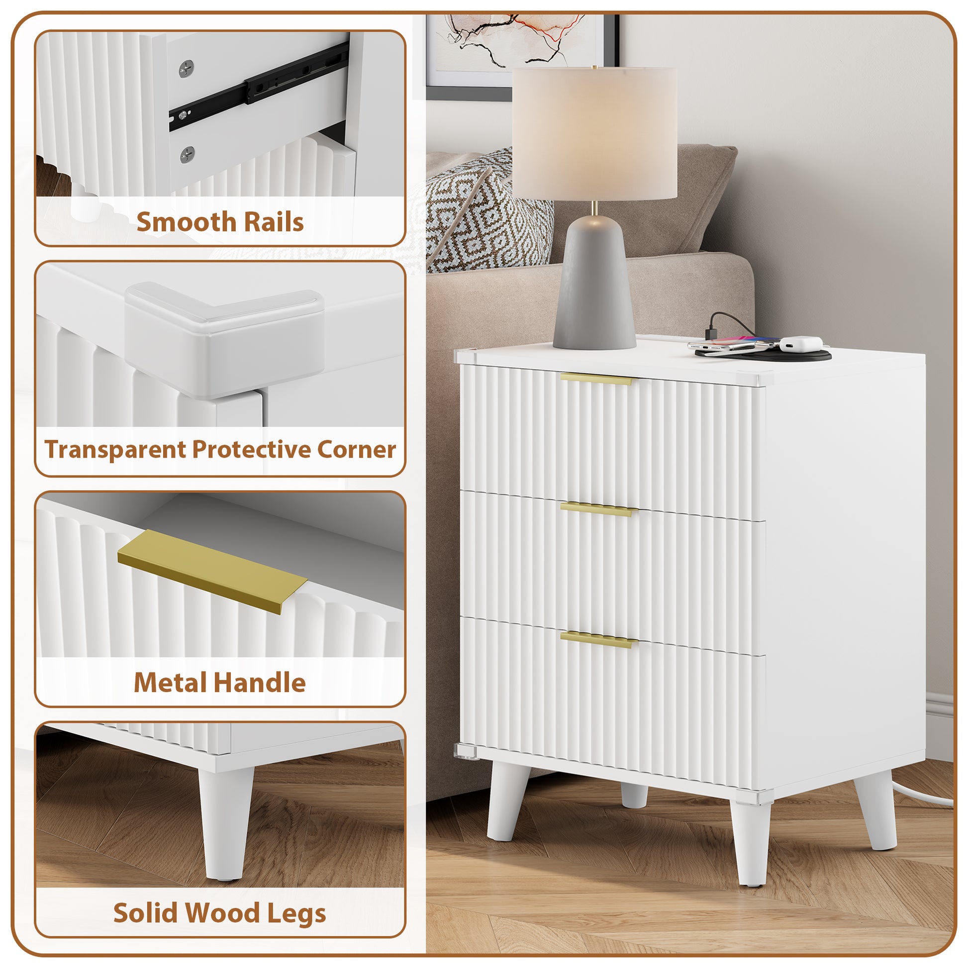 Laintene 3-Drawer Dresser for Bedroom, Nightstand with Charging Station - Modern Fluted with Solid Wood Legs, 2 AC Outlets & 2 USB Ports, Small End Table with Storage, White