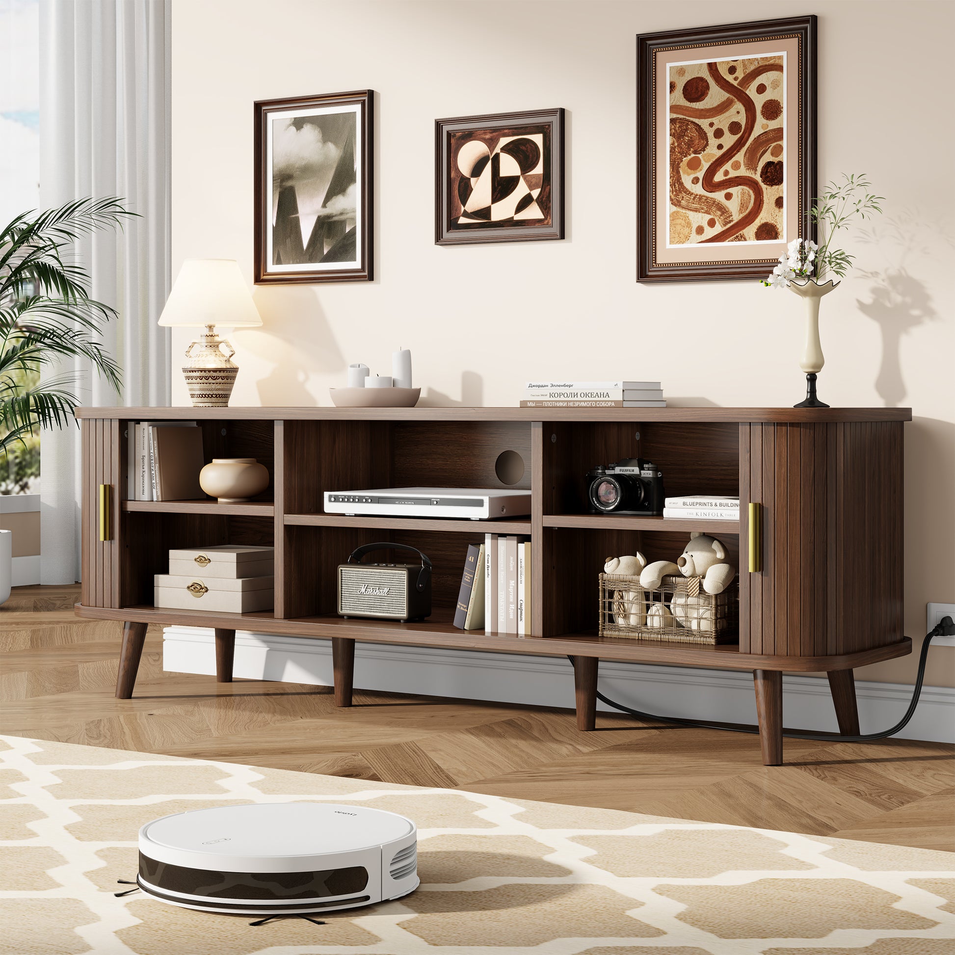 Fluted Sliding Door TV Stand for 65" TVs: This modern TV cabinet features a textured fluted design and smooth-sliding for easy access. The black walnut finish adds elegance to living rooms, bedrooms, or home offices.