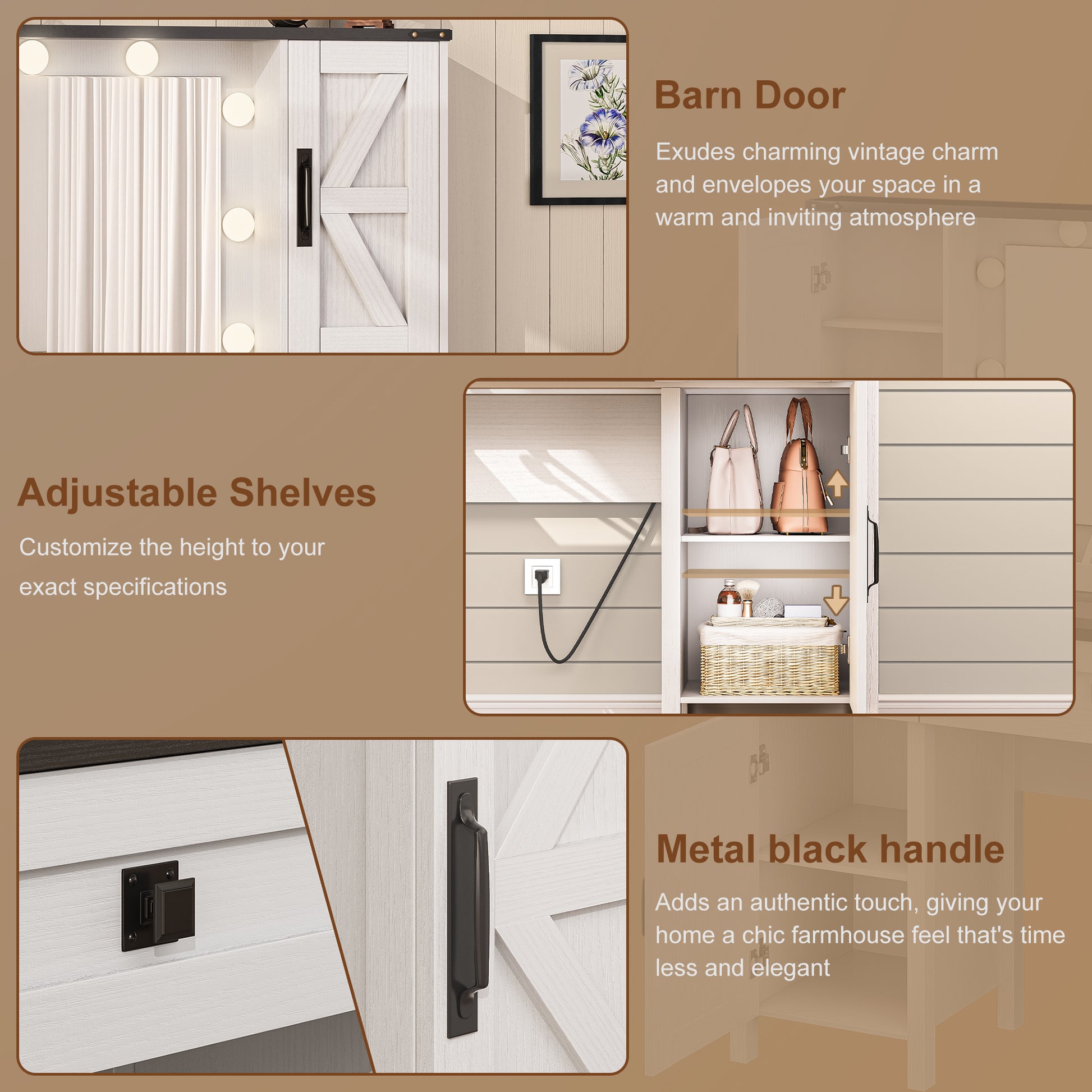 Create your dream beauty space with this farmhouse-style vanity desk, featuring a large LED mirror (3 color temperatures), 2 USB + 2 AC outlets, and transparent glass top for easy access to your makeup. The rustic white finish blends with any decor, while 2 spacious drawers + side shelves keep cosmetics, hair tools, and skincare organized. No more messy cords—charge devices directly at your vanity! Easy assembly with step-by-step instructions. Perfect for bedrooms, dressing rooms, or gift-giving.