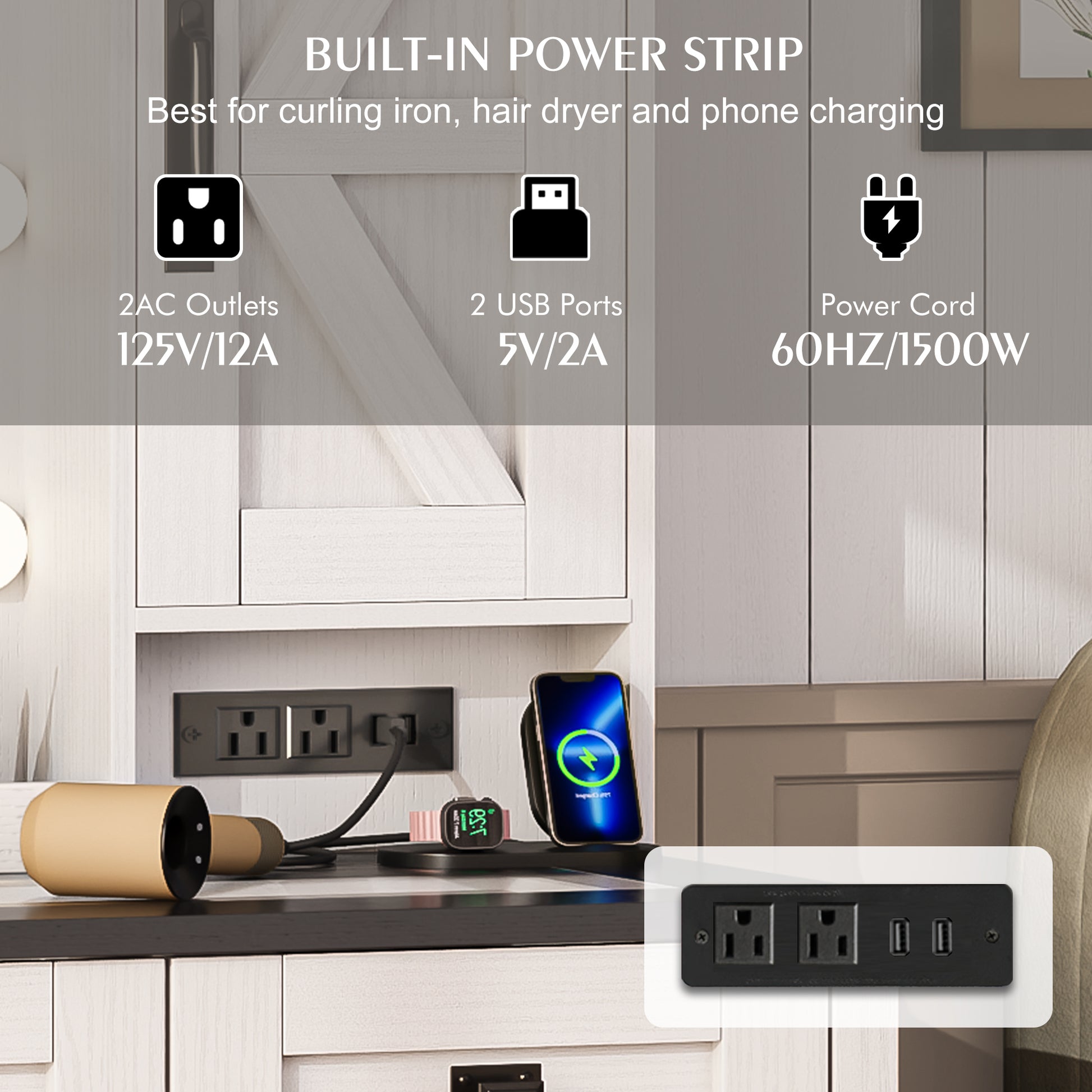 Built-in Charging Station (2 USB + 2 AC Outlets): Power hair tools, phones, or LED rings lights directly from your dressing table—no extension cords needed!