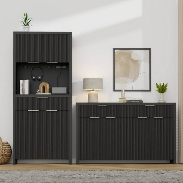 Laintene Fluted Cabinet Set - 70.8"H Pantry with Power Outlet, 55" L Sideboard with Storage Drawers, Adjustable Shelves Storage, Black