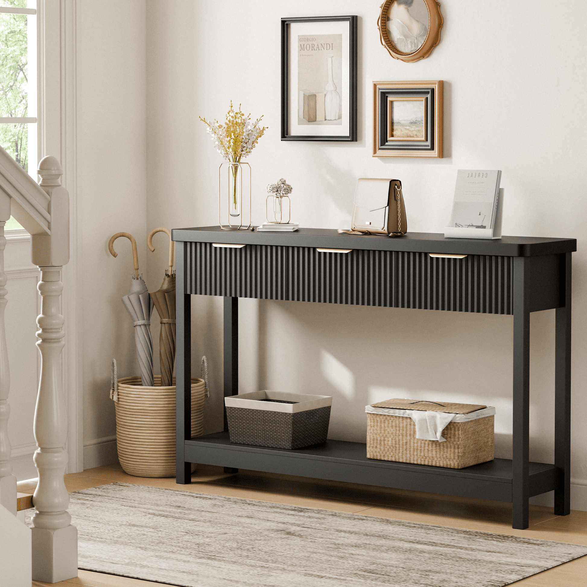 3 Drawers & Open Shelf Storage – Spacious storage black entryway table keeps keys, wallets, and gloves organized, while the open shelf is ideal for decorative items, baskets, or books.