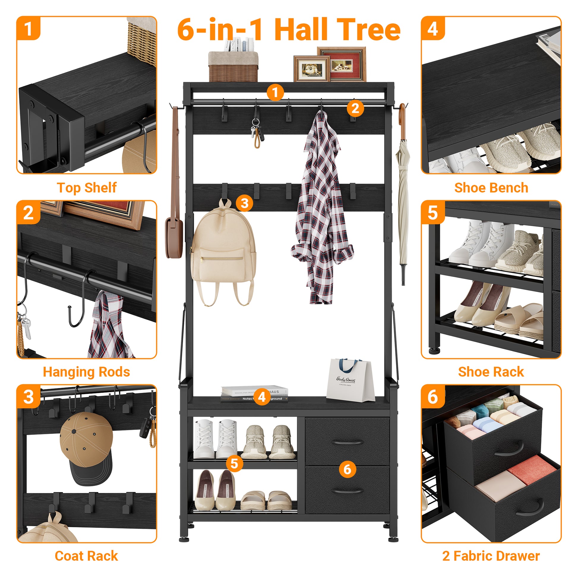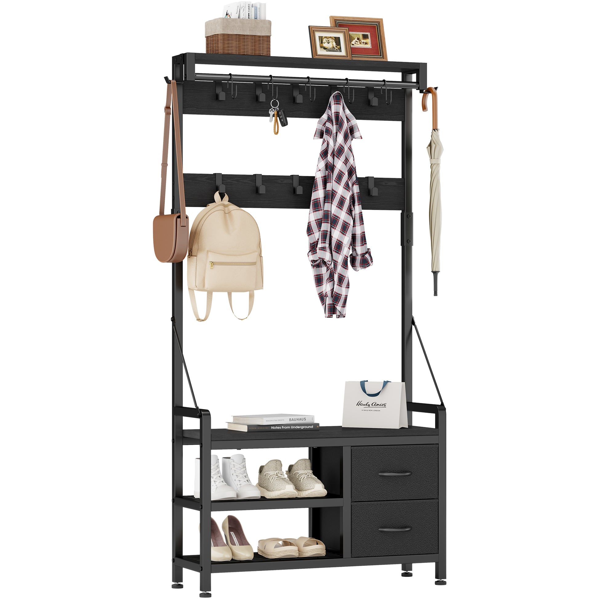 All-in-One Entryway Storage: Say goodbye to clutter with our all-in-one hall tree coat rack, a versatile storage solution that combines six essential functions. With 17 adjustable hooks, a sturdy 300lb shoe bench, two shoe racks, two drawers, a hanging rod, and a top shelf, this unit offers ample space for coats, bags, shoes and decor.