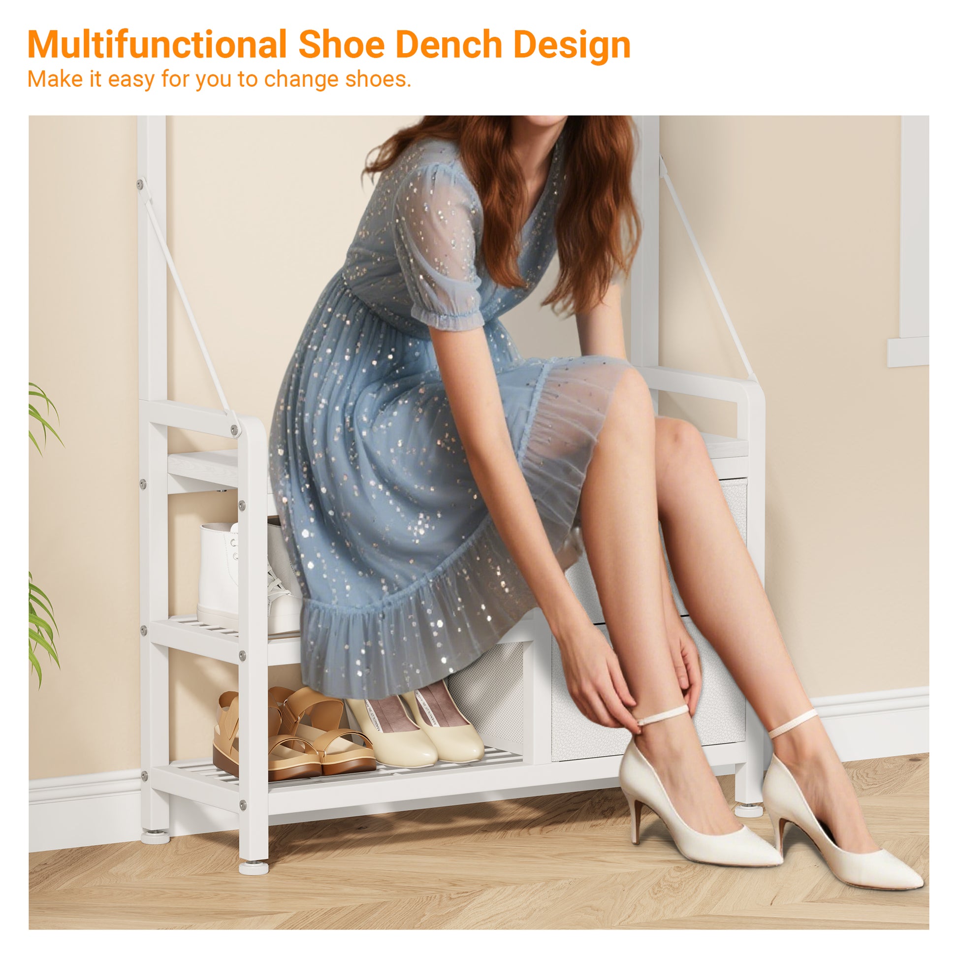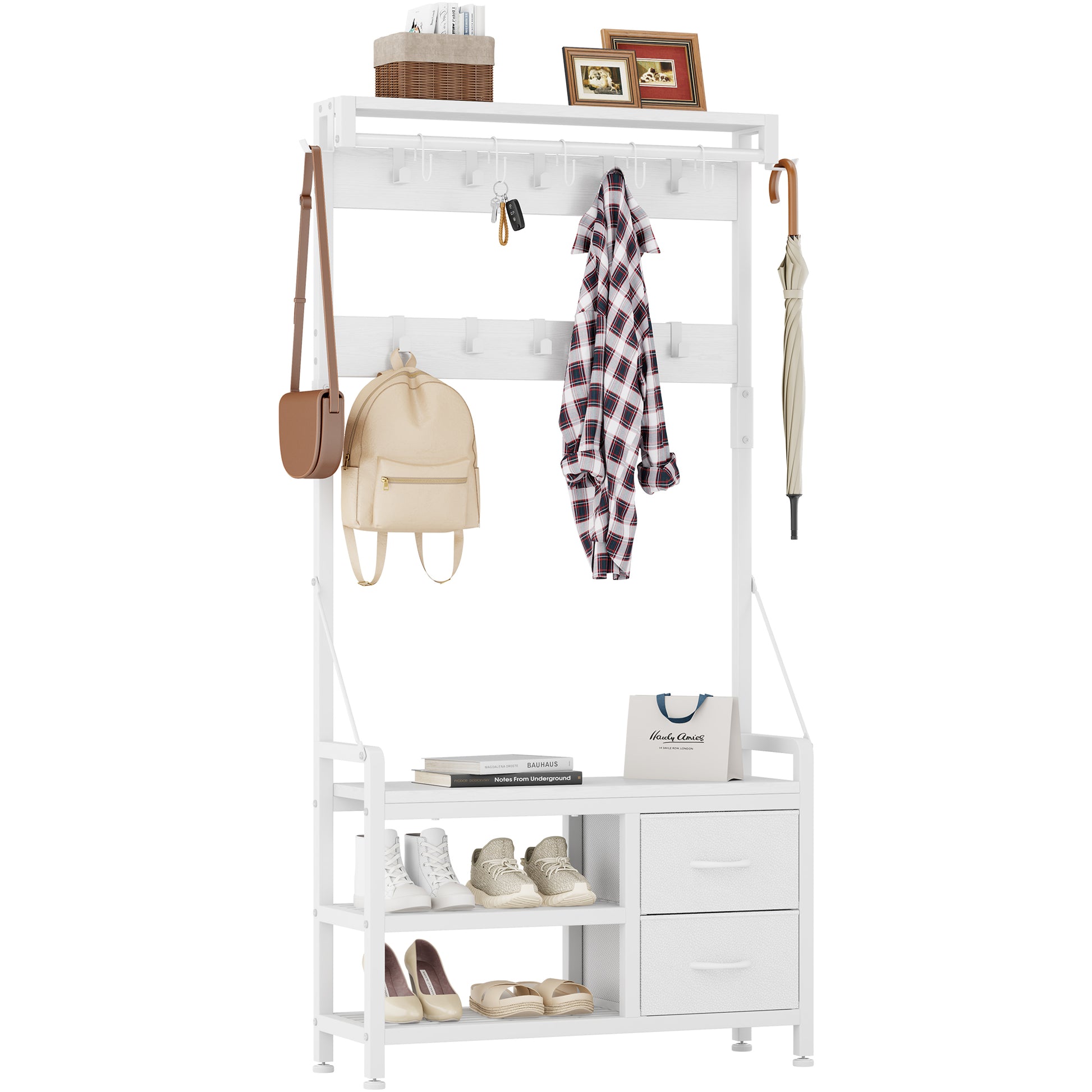 Laintene Hall Tree with Bench - 6-in-1 Industrial 31.5" Entryway Organizer, 17 Adjustable Hooks & 2 Drawers, Hanging Rod & Top Shelf, 300lb Weight Capacity for Hallway and Living Room, White