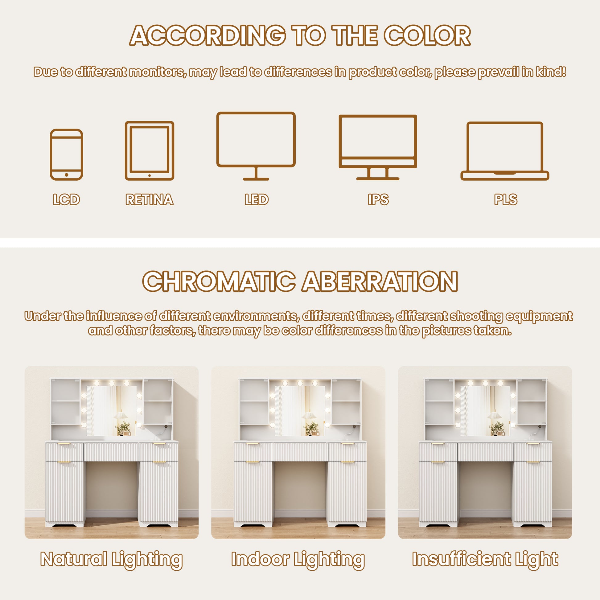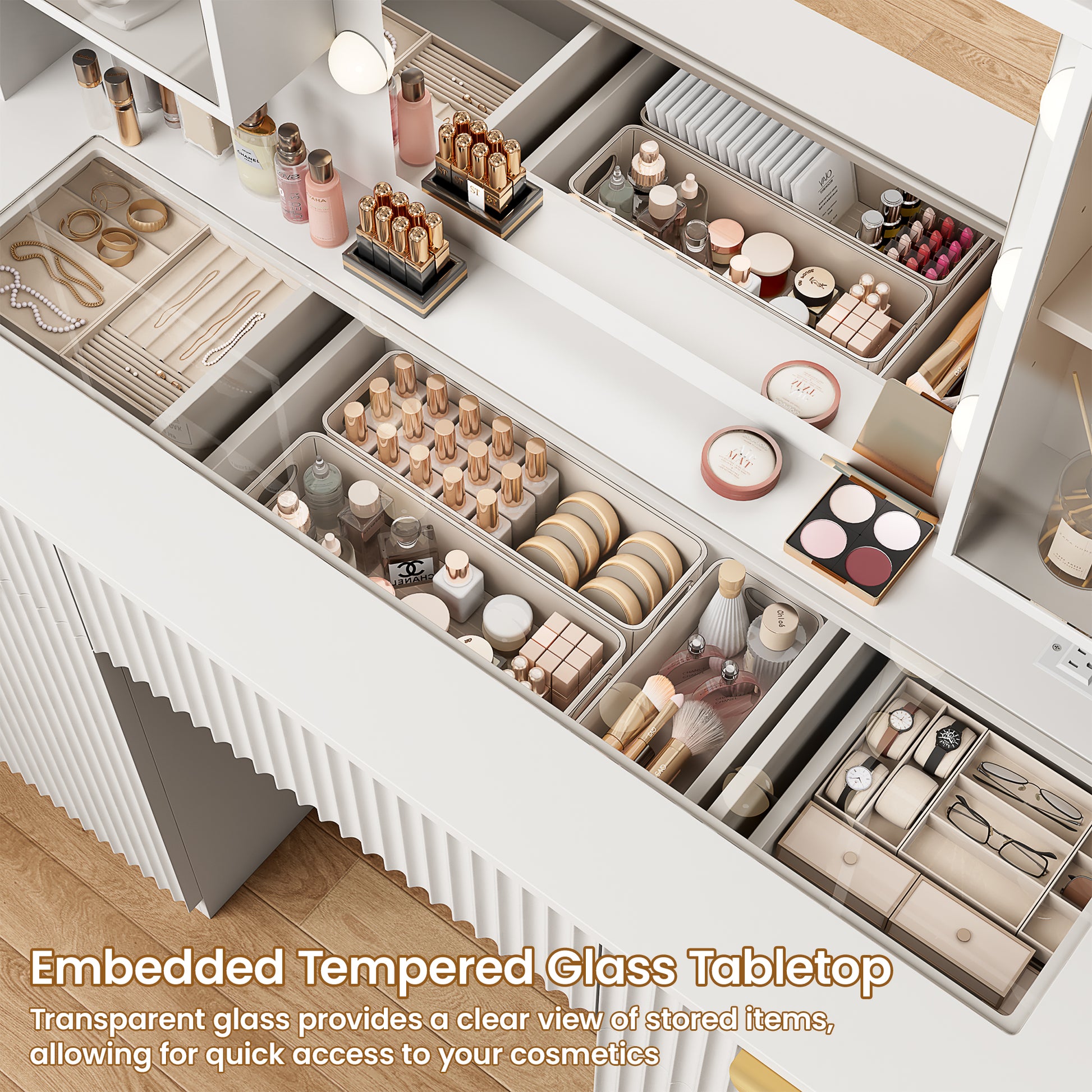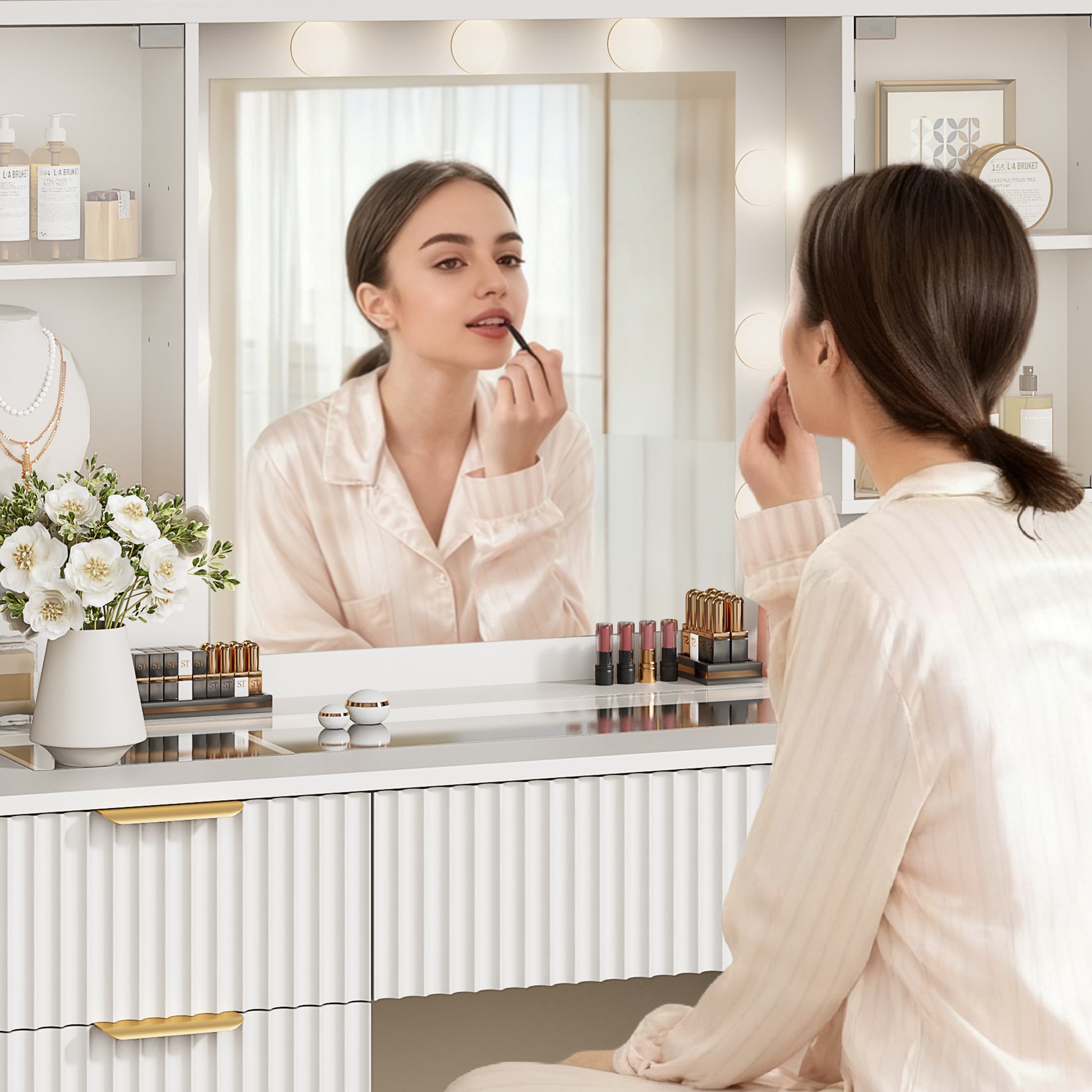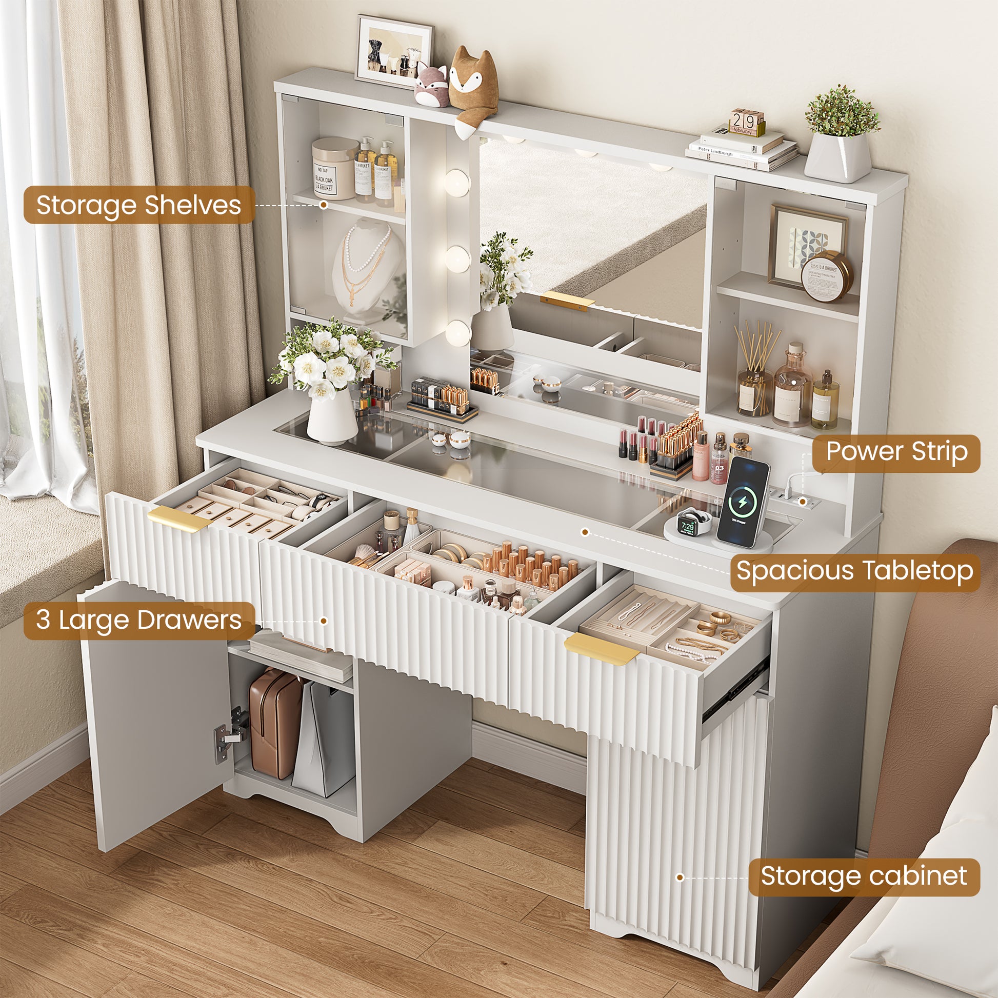 LainTene Makeup Vanity Table with Lights and Mirror, Vanity Desk with 3 Drawers & 2 Large Storage Cabinets and Charging Station for Bedroom