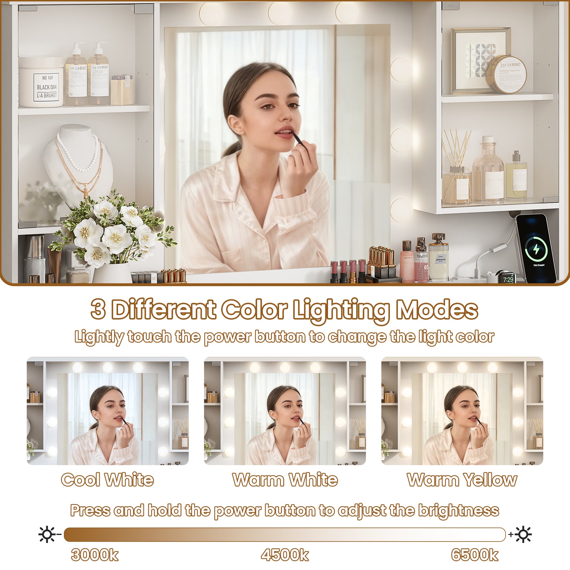 Smart mirror offers three lighting modes to match any time of day.