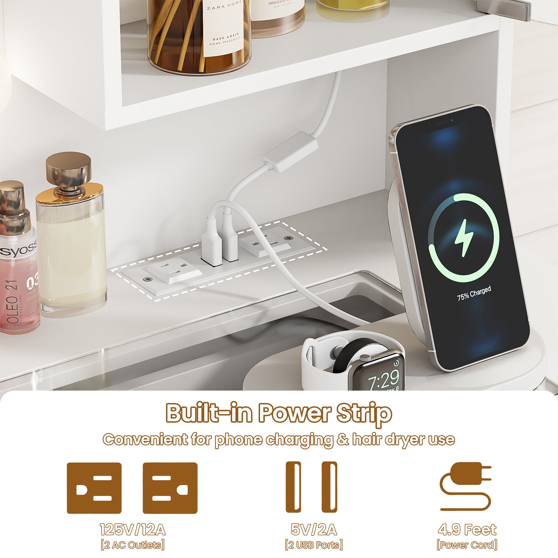 Built-in power strip with 2 outlets and 2 USB ports keeps devices charged.
