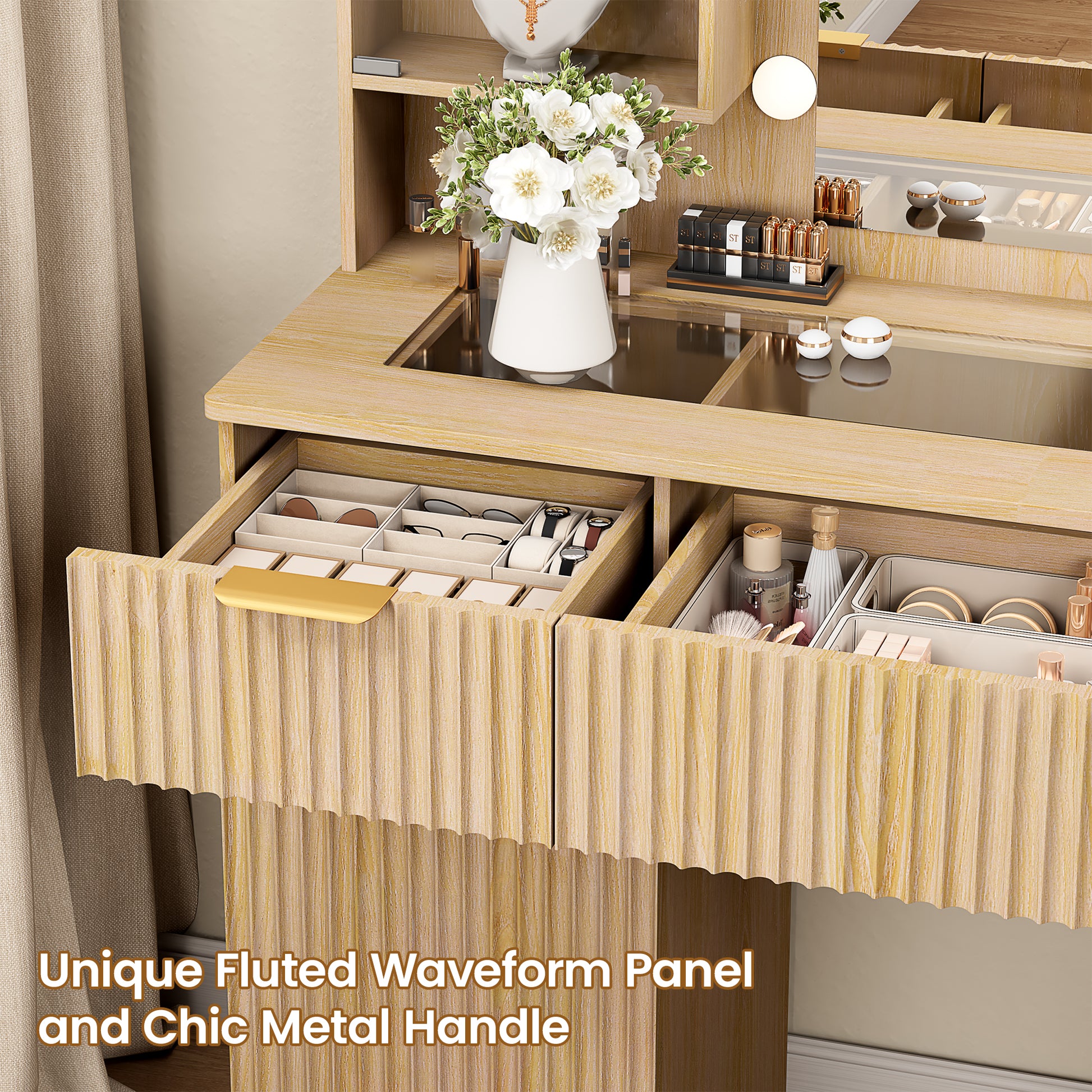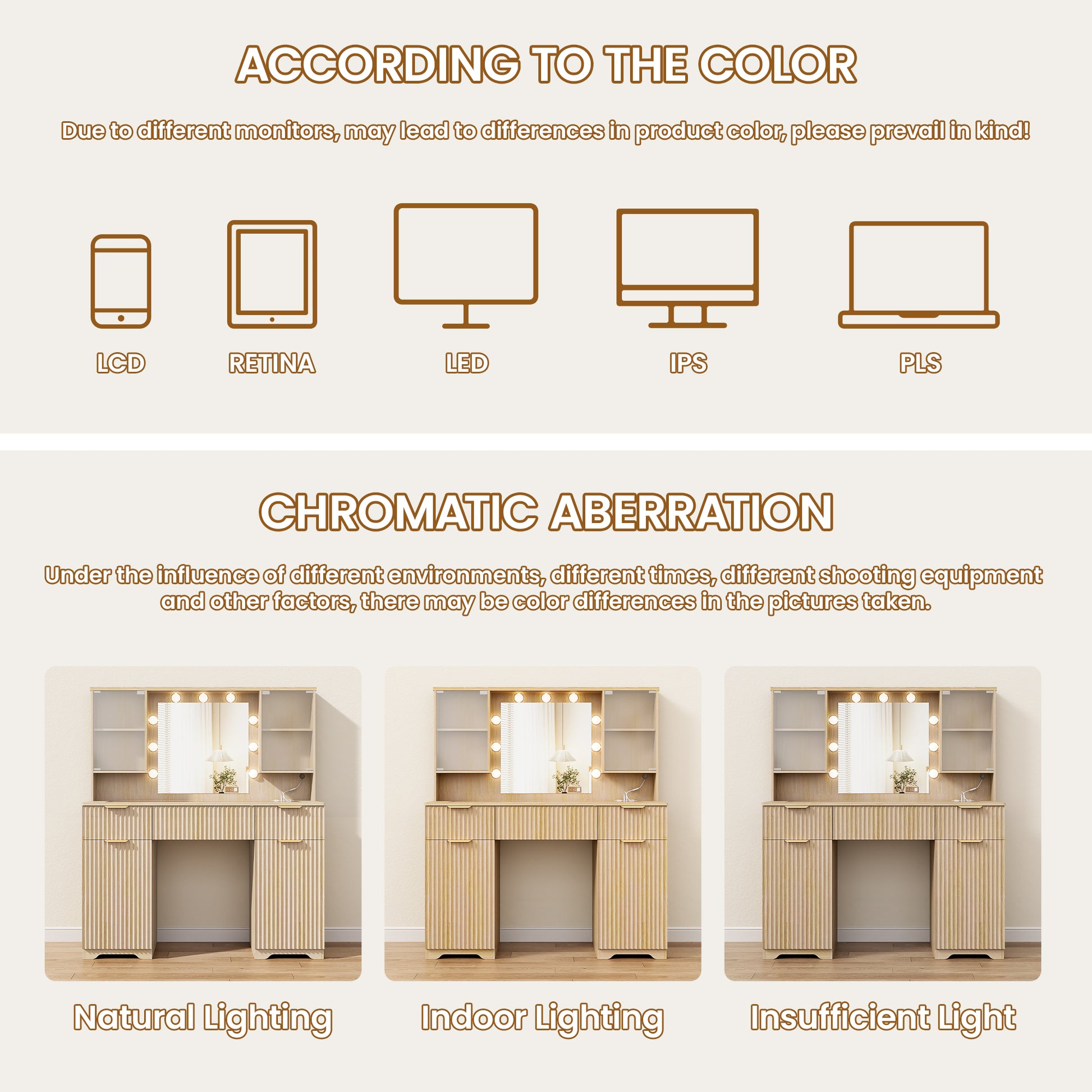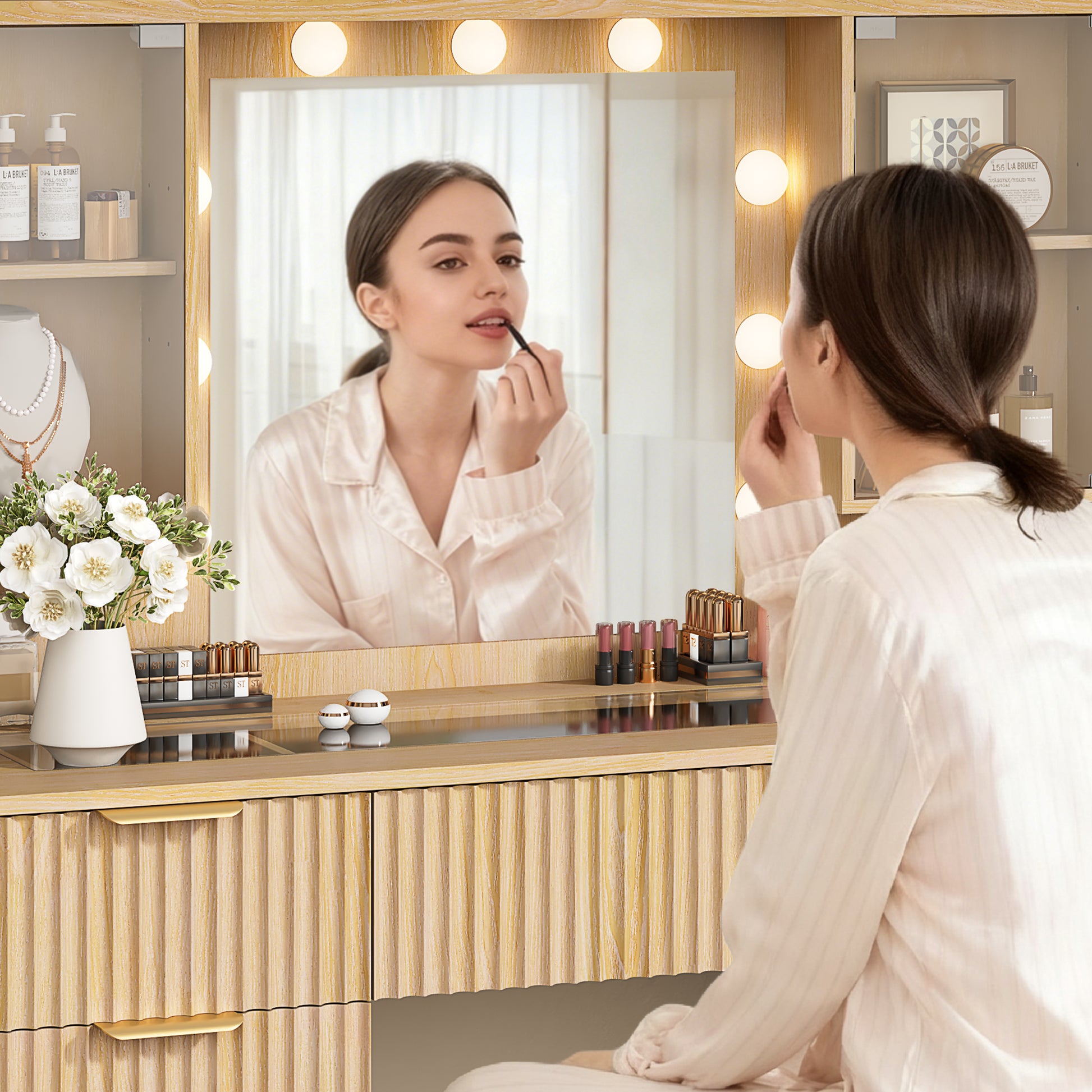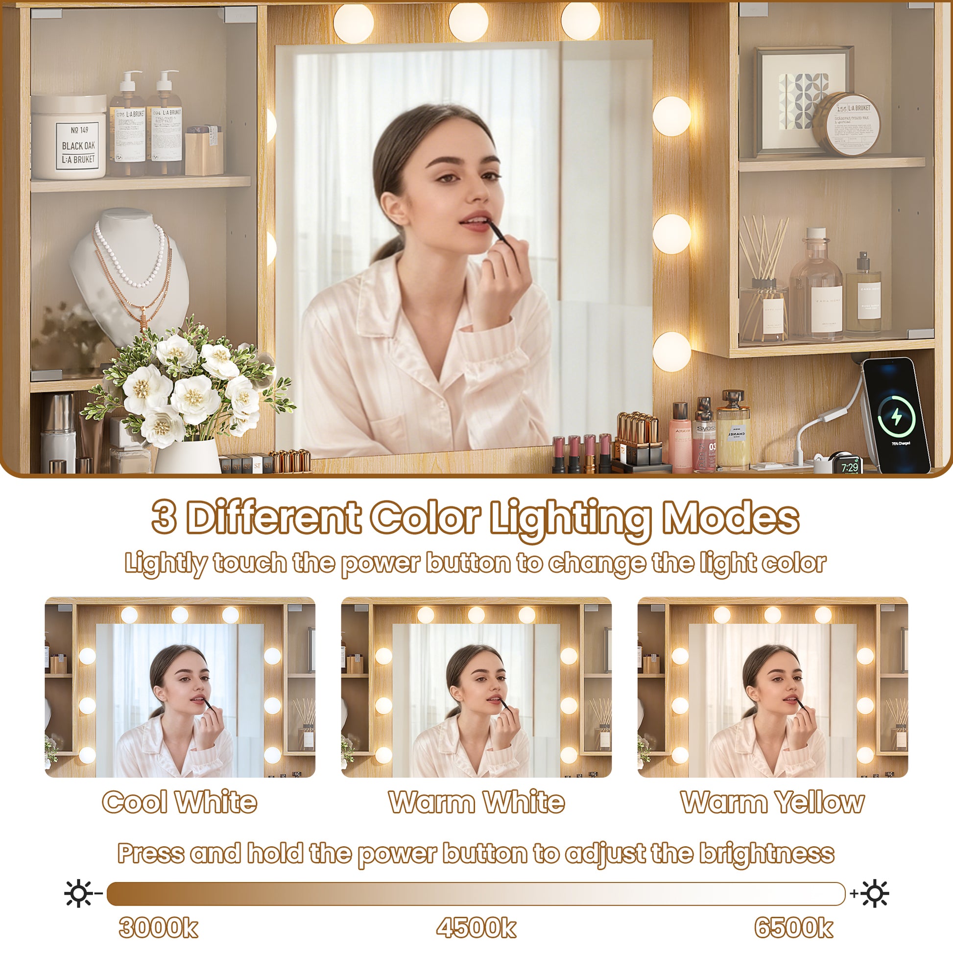 LainTene Makeup Vanity Table with Lights and Mirror, Vanity Desk with 3 Drawers & 2 Large Storage Cabinets and Charging Station for Bedroom