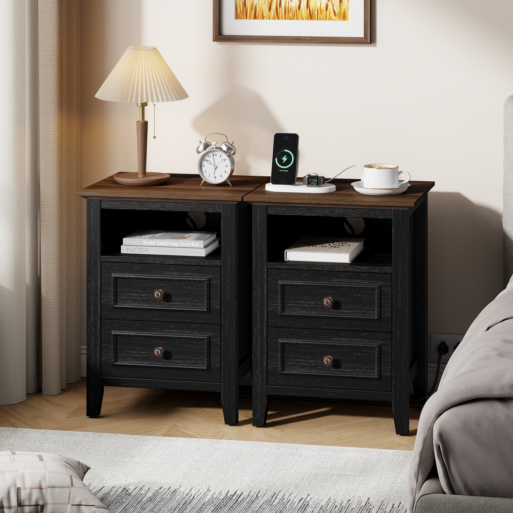 LainTene Nightstand with Charging Station, Farmhouse Bedside Table with 2 Drawers, USB & AC Outlets for Bedroom & Living Room, Oak Black Finish