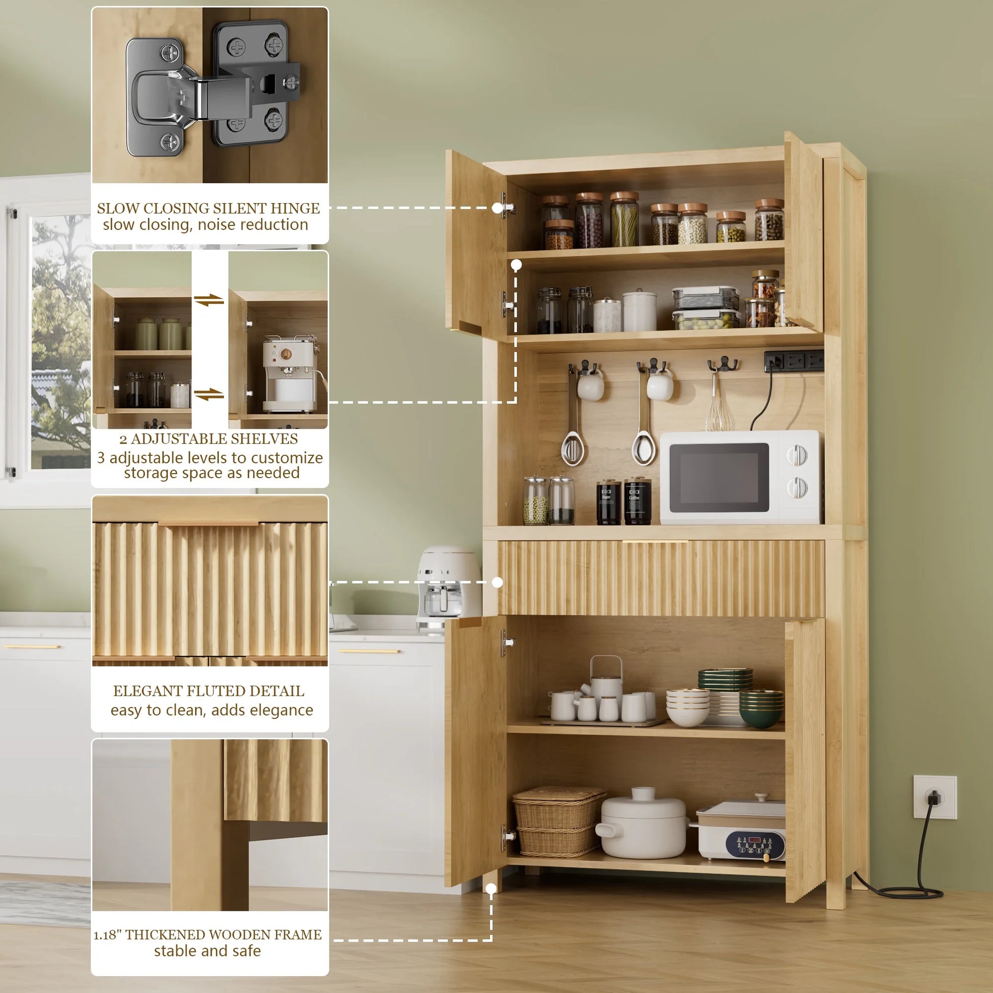 Laintene Pantry Cabinet with Charging Station & Drawer, Fluted Storage Cabinet with Adjustable Shelves and Open Countertop for Dining Living Room, Natural Oak