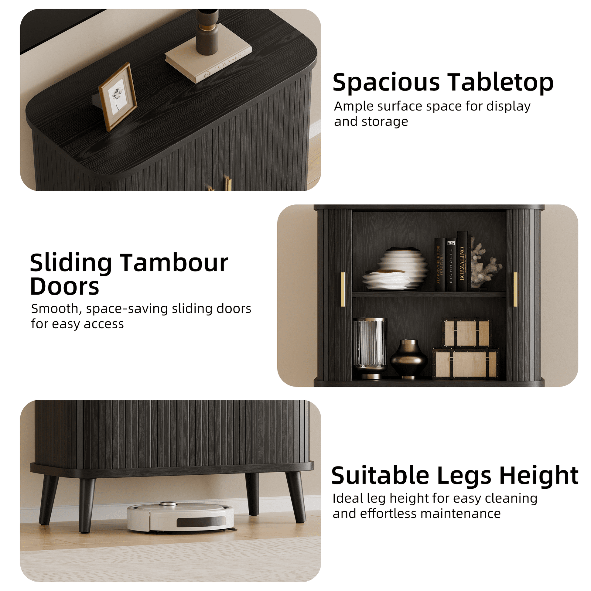 Laintene black storage cabinet with grille-striped doors combines rustic countryside charm with modern sophistication, creating a unique piece that enhances any room's decor. Serving as both a buffet cabinet and an eye-catching storage sideboard, this piece makes a stylish focal point in your living room, dining room, or office, adding both style and functionality to any setting.The entryway cabinet is compact in design. The open space at the top is spacious for decorations. The internal space can also be modified by adjusting the height of the shelf. The metal legs at the bottom are high enough to hold a vacuum cleaner for easy cleaning.