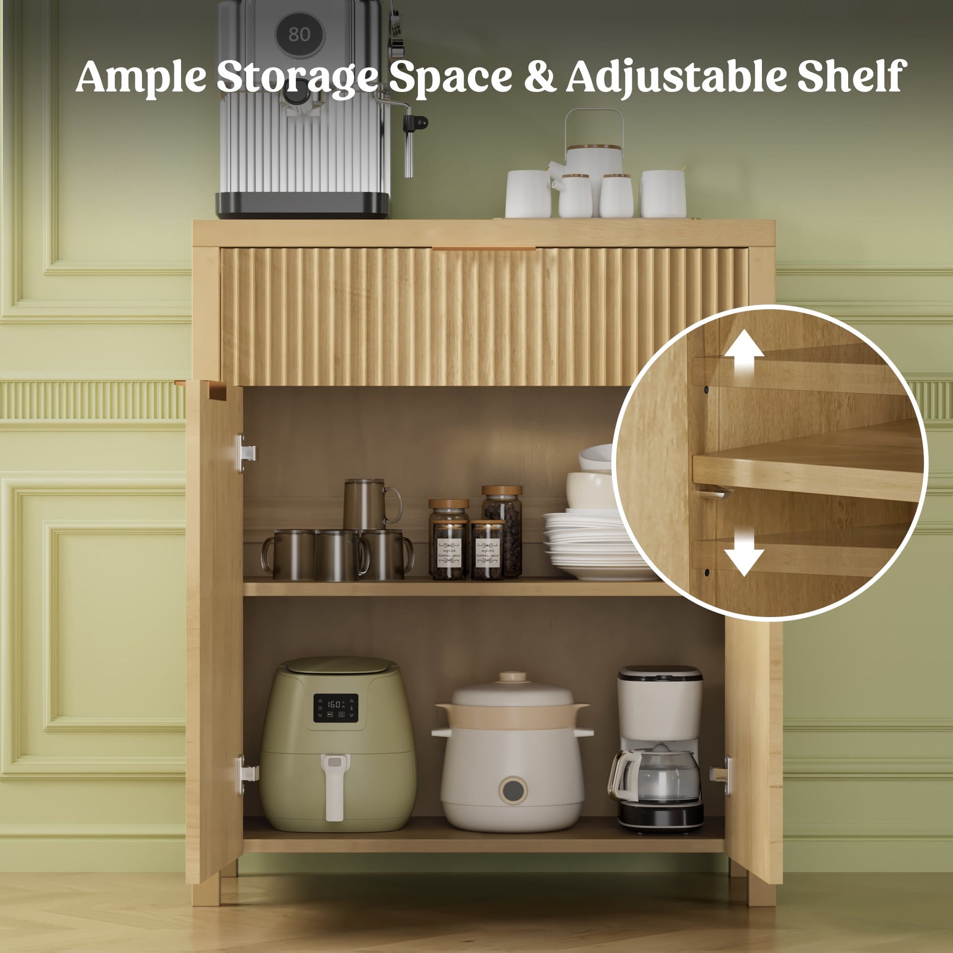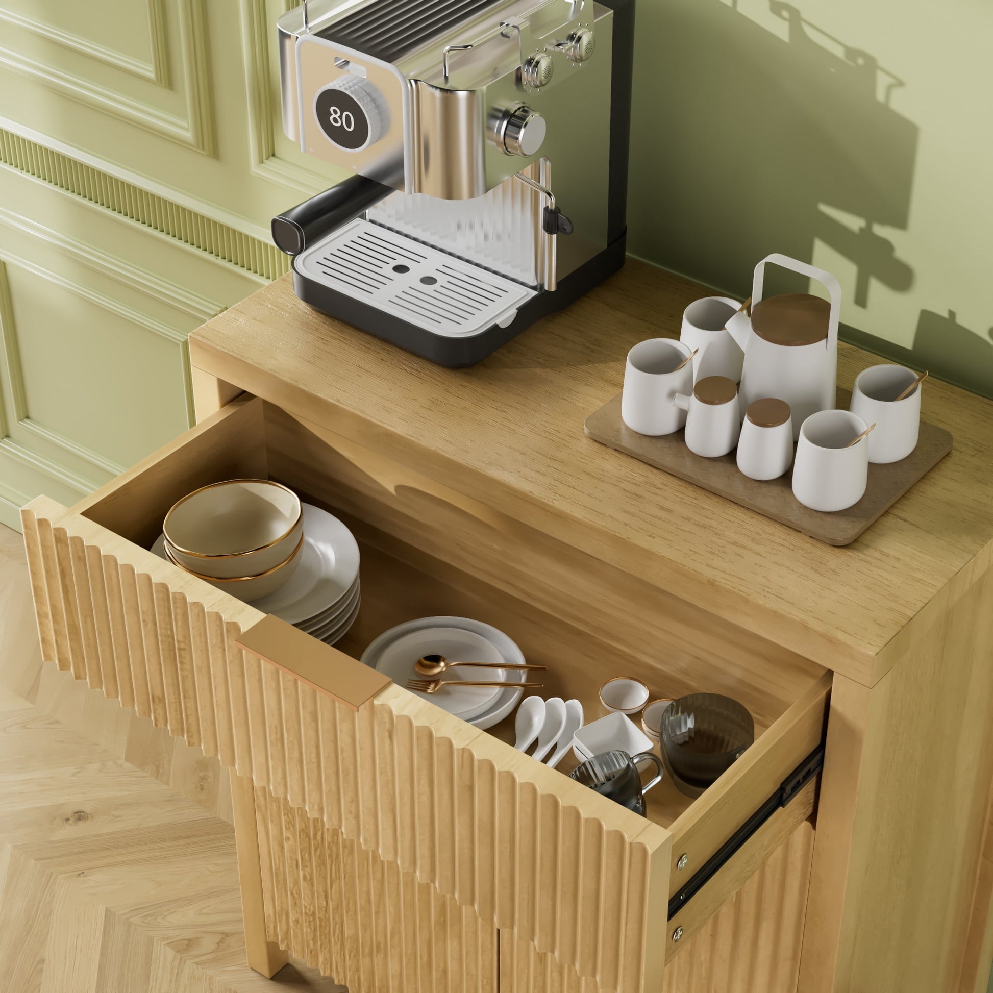 Elevate your space with Laintene stylish sideboard storage cabinet. Featuring elegant fluted doors and shelves, it offers both stylish display and concealed storage, making it a perfect buffet cabinet for the kitchen or a versatile credenza. The solid wood legs provide exceptional sturdy and durable support, ensuring long-lasting reliability. Soft-close hinges on the cabinet doors eliminate banging noises so you can experience quiet operation. The sleek L-shaped metal handle adds a modern touch while ensuring easy and comfortable opening.