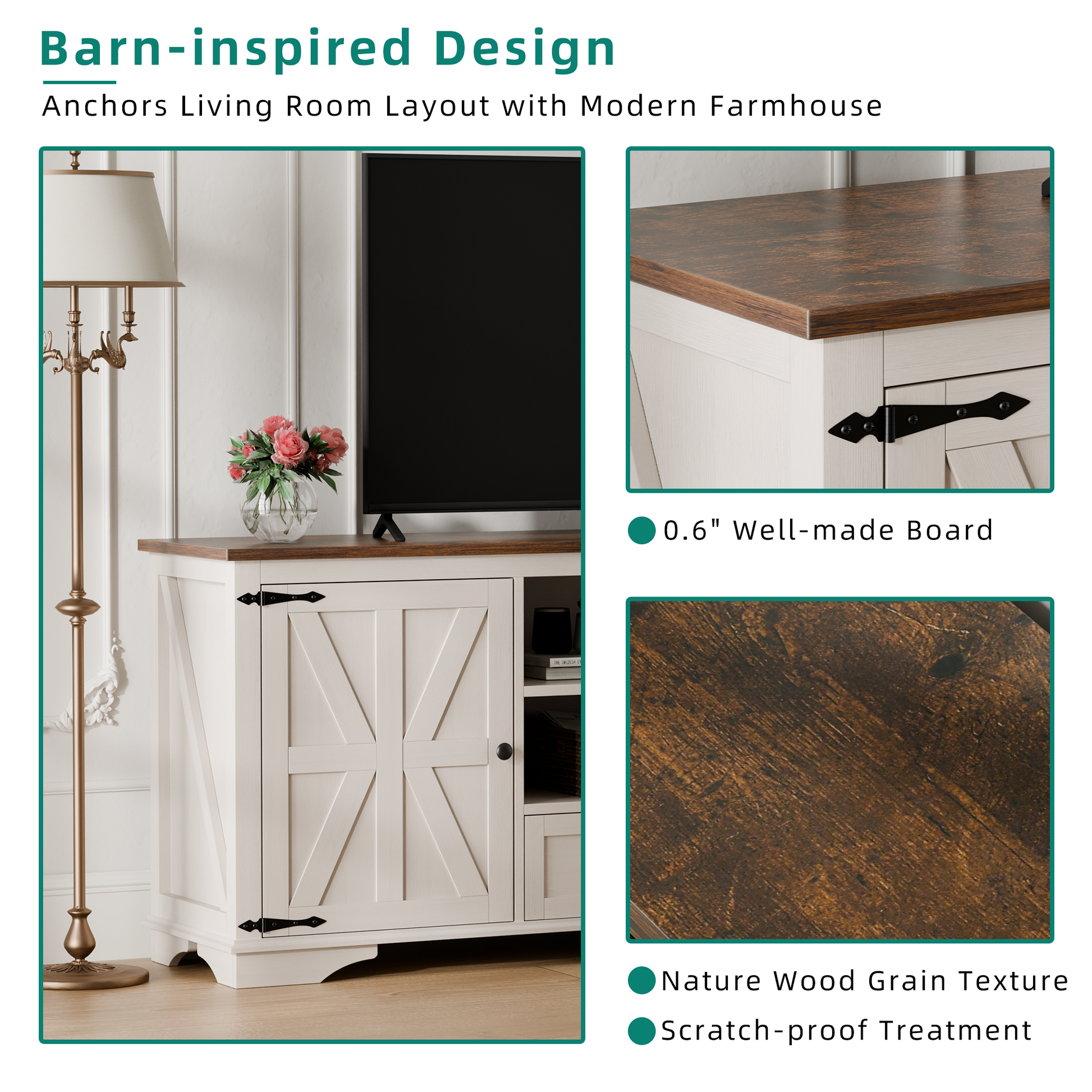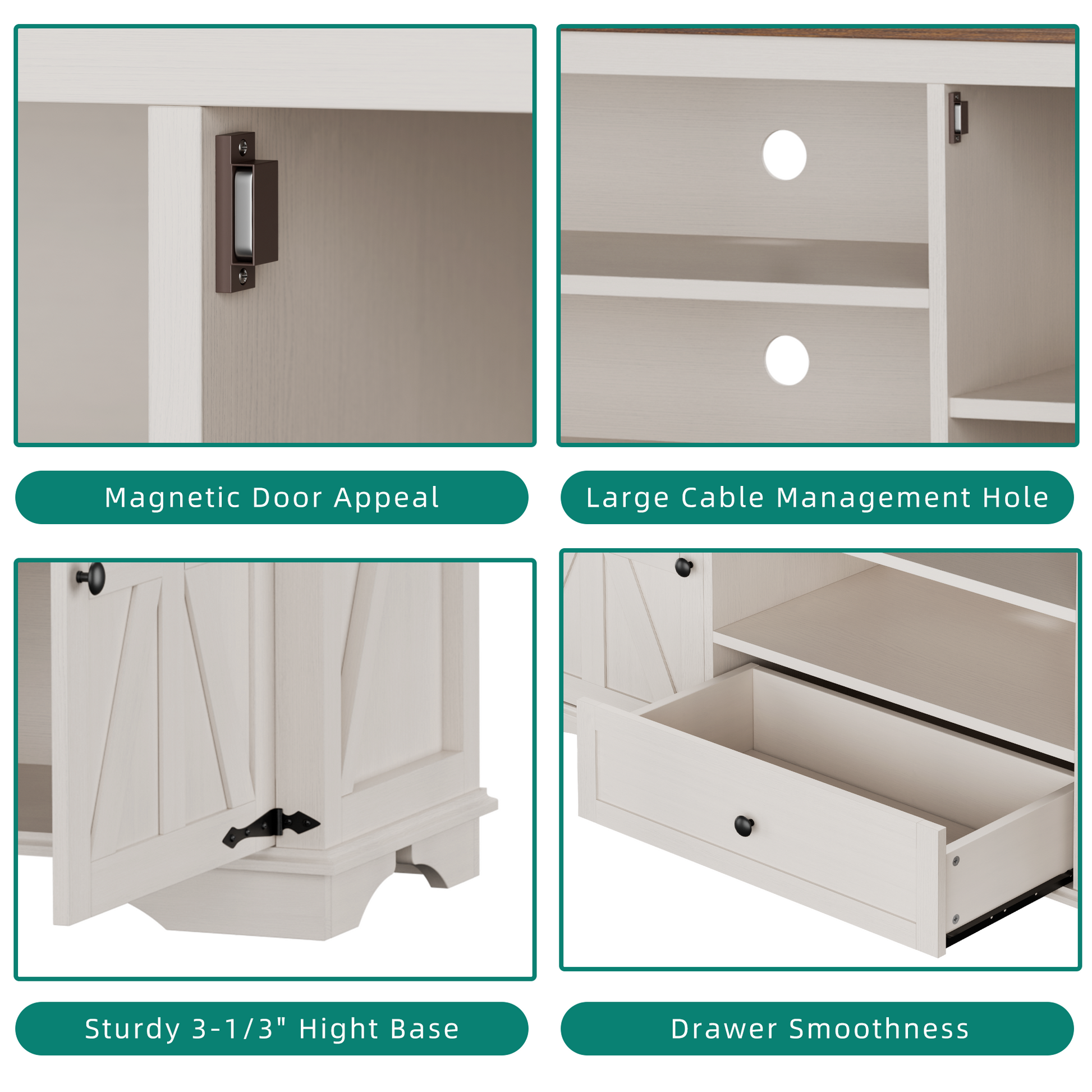 Versatile Entertainment Center Storage: The white TV stand offers 4-in-1 organization: generous TV table top, open middle shelf, smooth drawer, and dual barn-door cabinets - perfect for all your media components in one stylish TV stands solution.