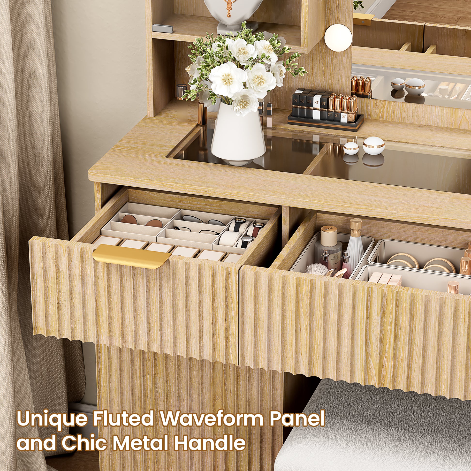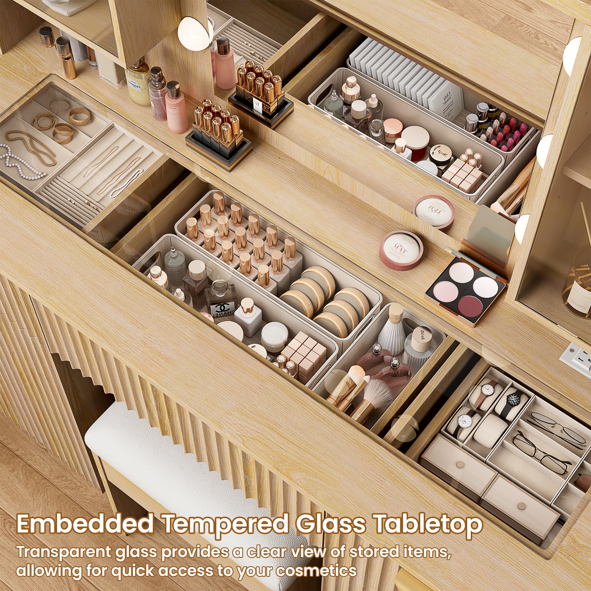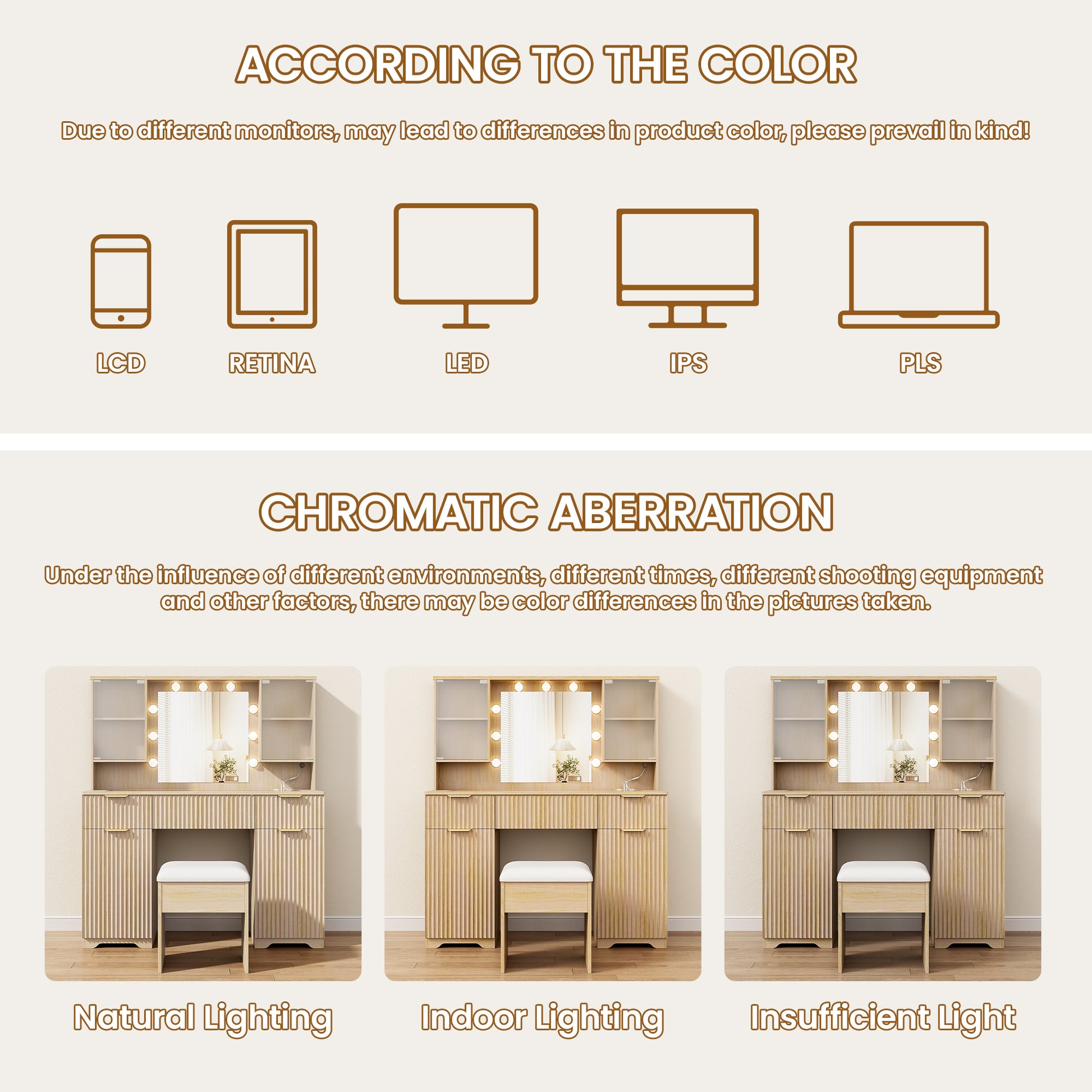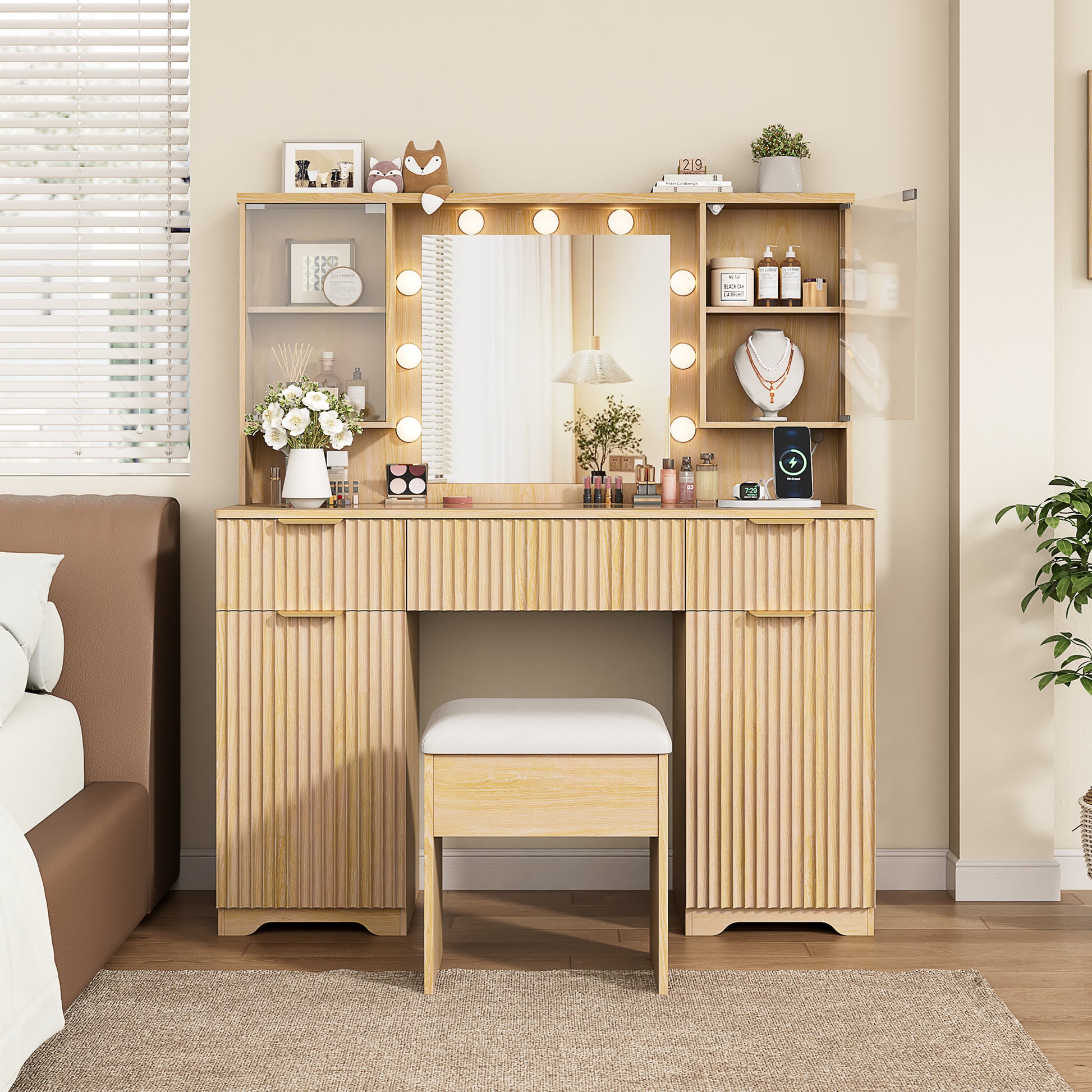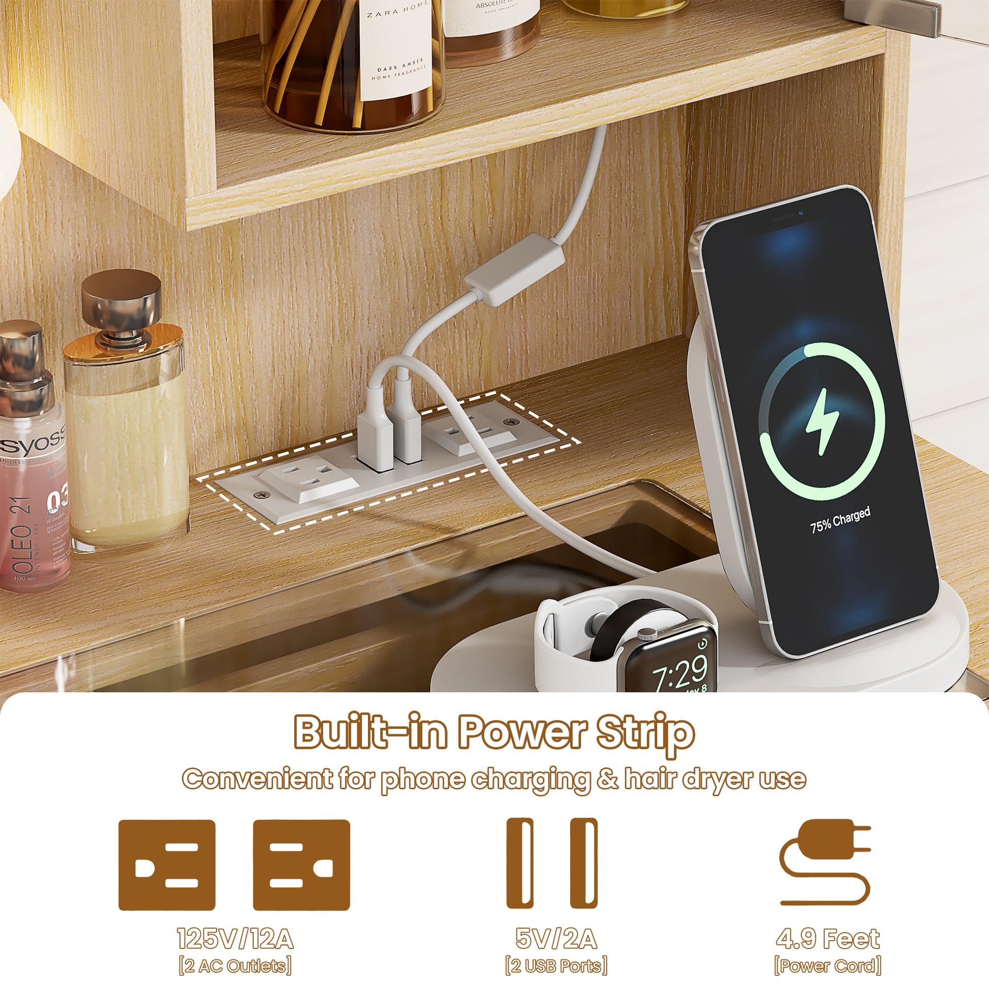 LainTene Vanity Set with Stool, Makeup Vanity Table with Lights and Mirror, Vanity Desk with 3 Drawers & 2 Large Storage Cabinets and Charging Station for Bedroom