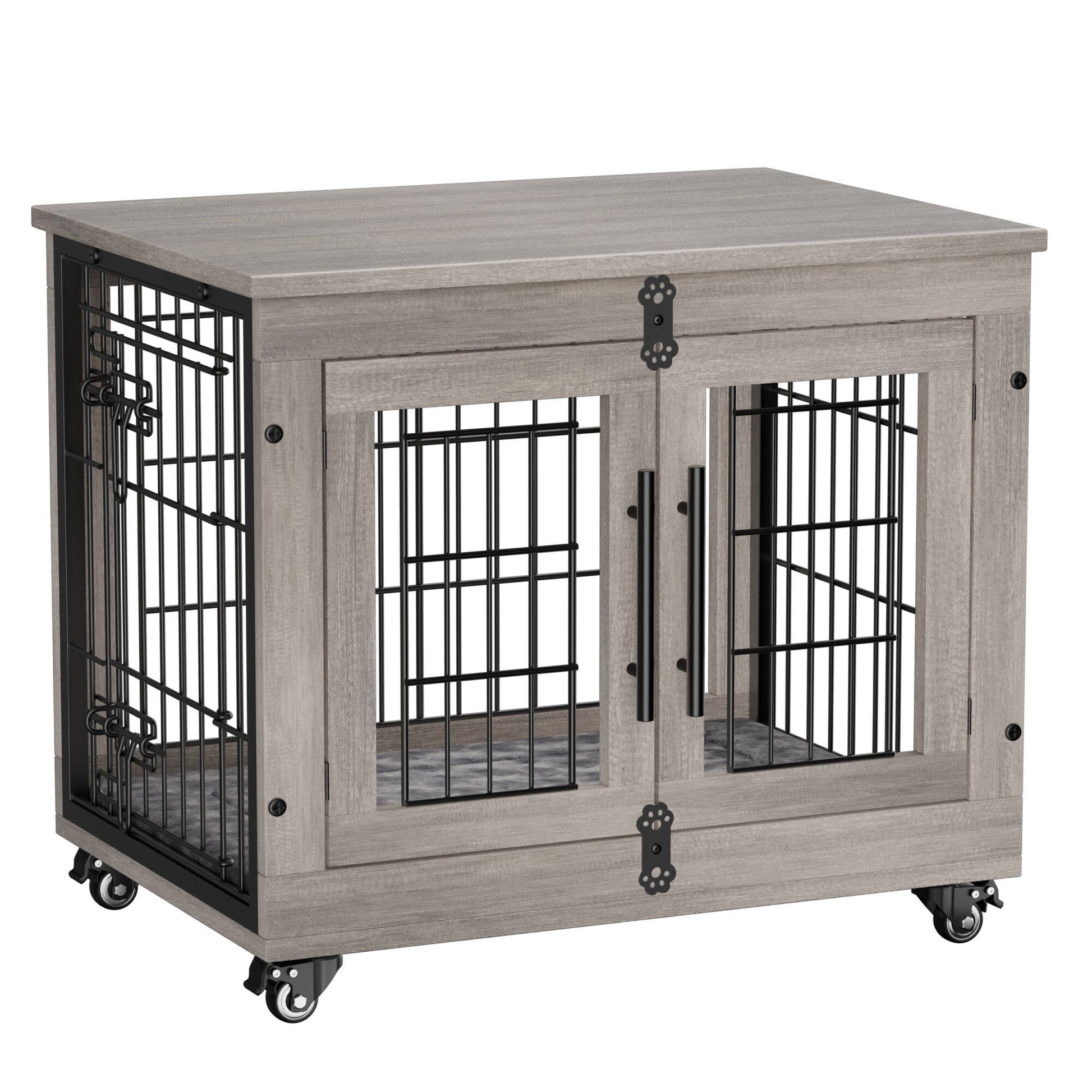 LainTene Wooden Dog Crate Furniture, Double Doors Dog Kennels for Inside with Pads and Wheels, Heavy Duty Dog Cage for Small Dogs, Gray